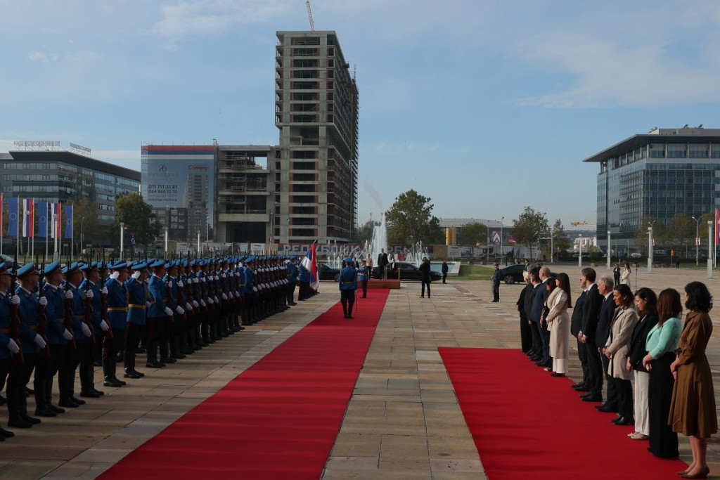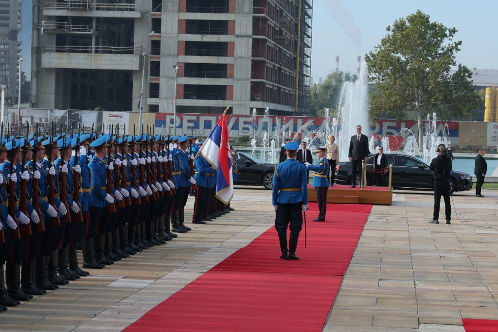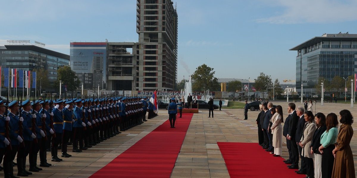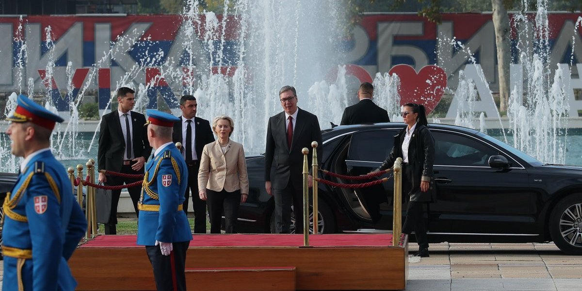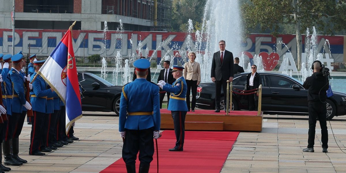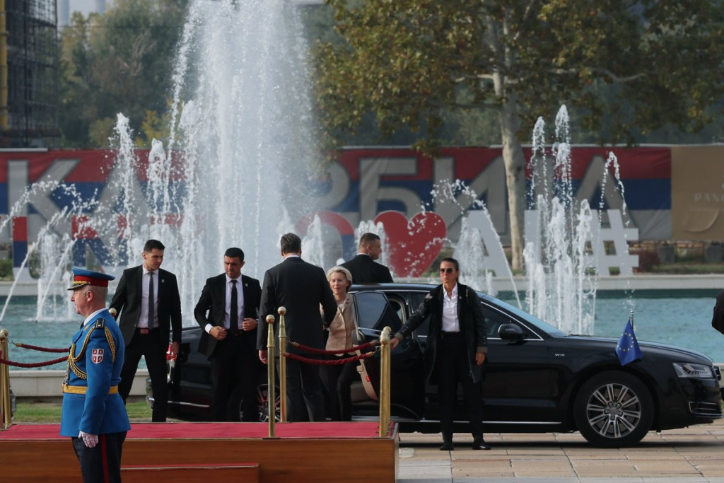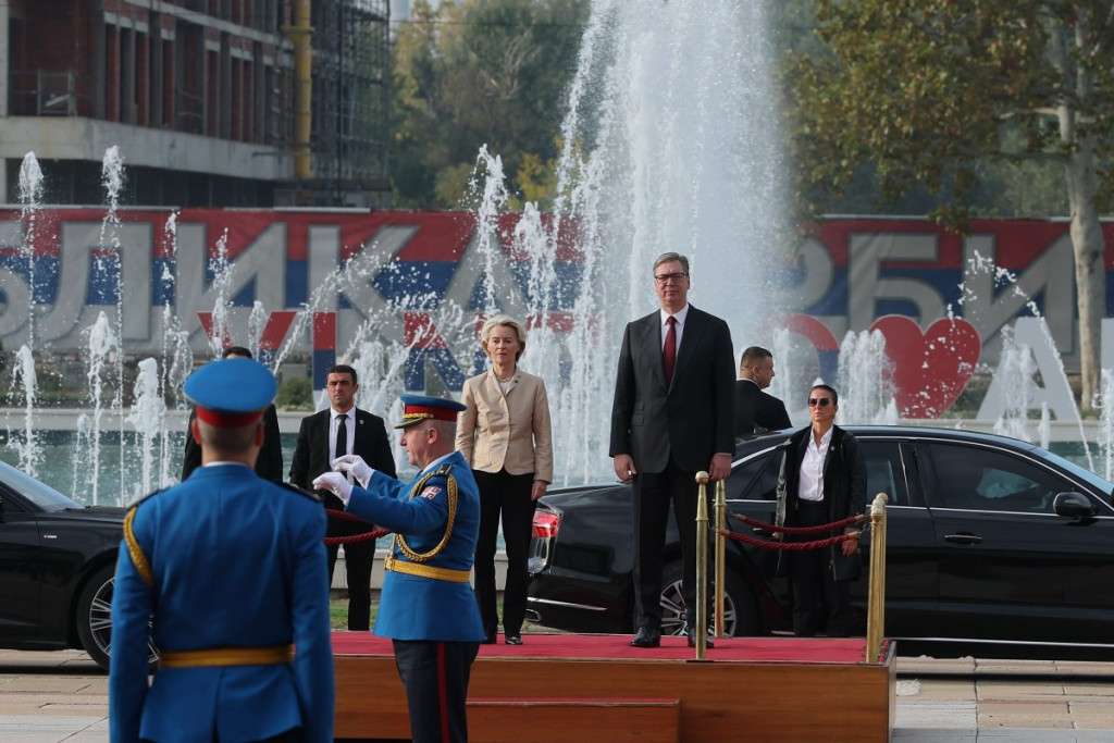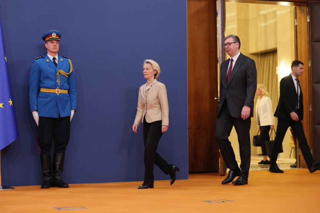 Predsednik je Ursulu fon der Lajen dočekao svečano ispred Palate "Srbija" uz himu, gardu i crveni tepih. Nakon toga je usledio tet-a-tet sastanak Vučića i Fon der Lajen.