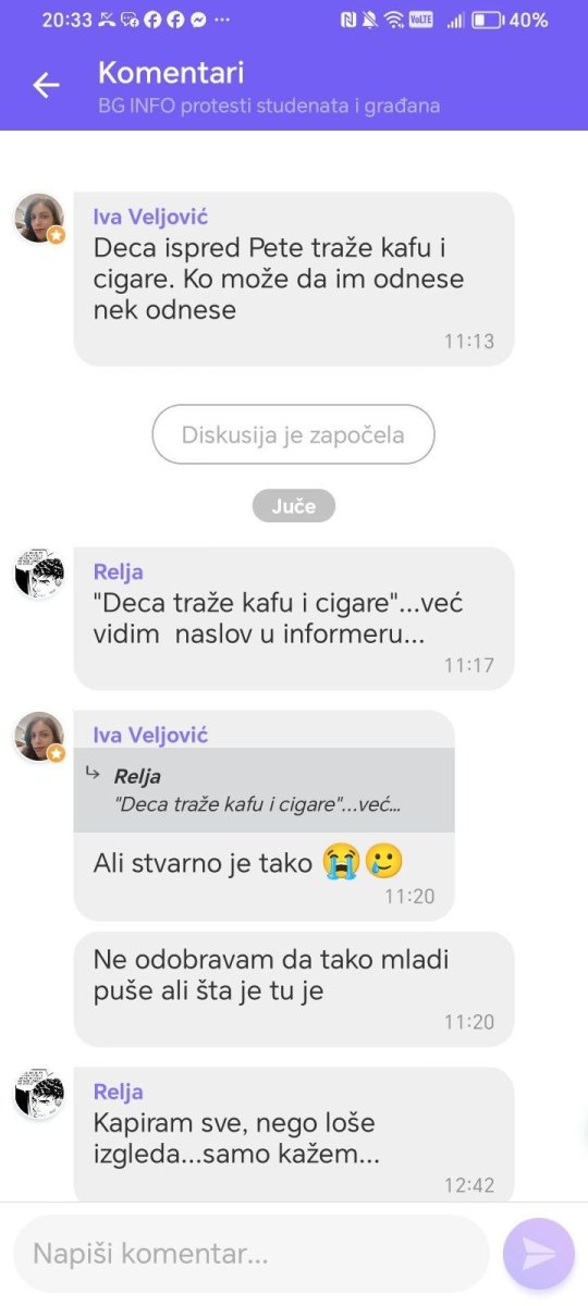 Dokle sve ide, vidimo i sami, maloletna deca traže cigarete, kafu, pa gde su tu roditelji, vode li računa o svojoj deci? Ili će im oni odneti to što traže, ne bi me ni to čudilo. Ovu blokadu su baš roditelji započeli.