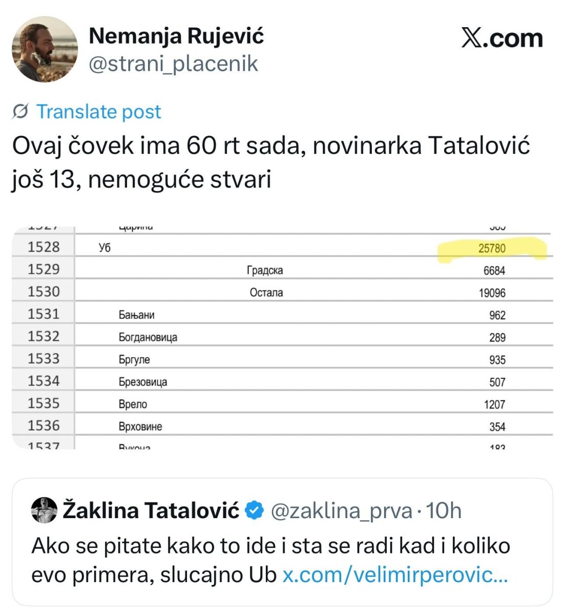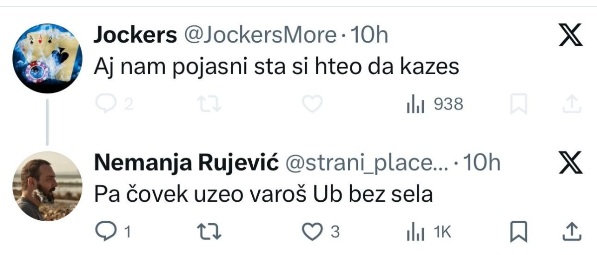 U svojoj objavi Rujević je konstatovao da su tvrdnje o navodnoj izbornoj prevari bazirane samo na osnovu opštine Ub, ne računajući sela.