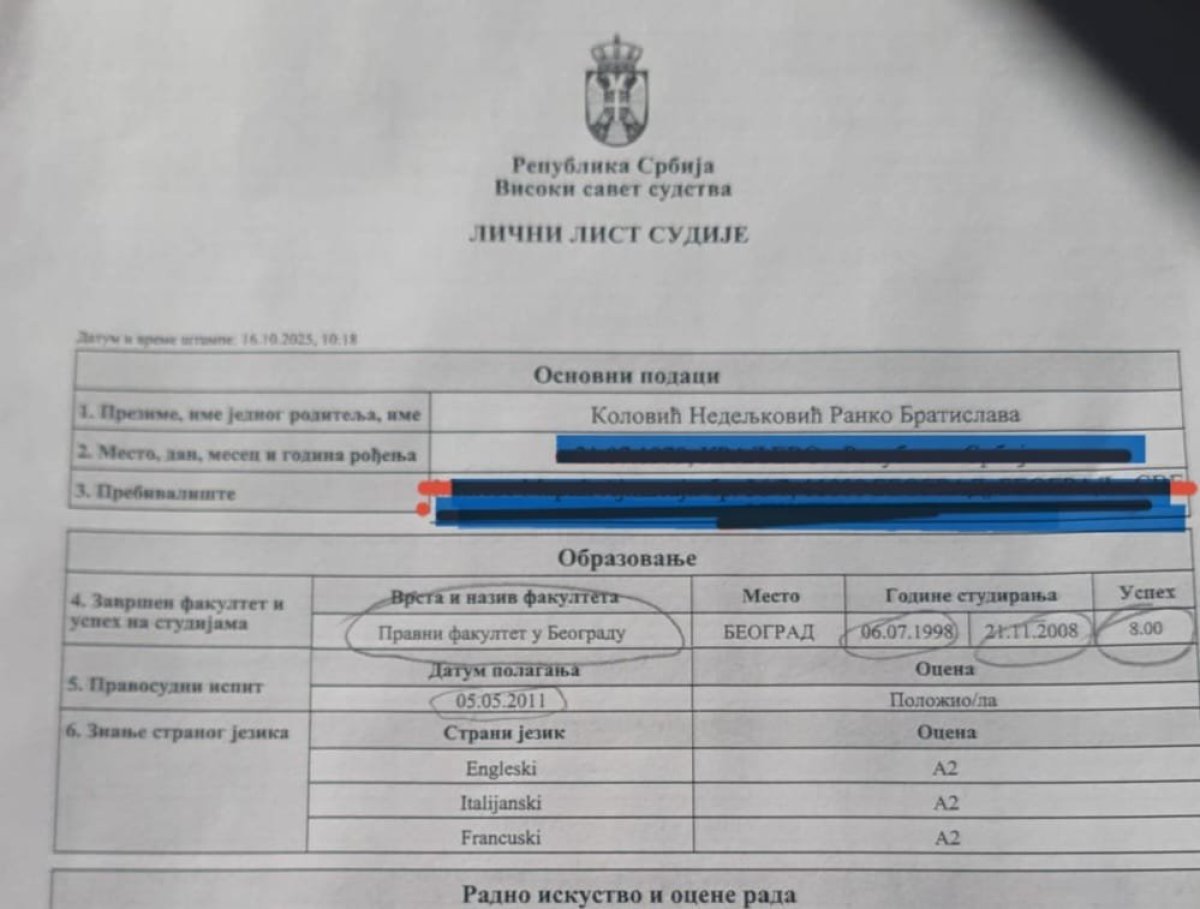Nakon skandaloznog saznanja da kandidatkinja za člana Visokog saveta sudstva, jednog od najviših pravnih institucija u državi, Bratislava Kolović Nedeljković, sudija Prvog osnovnog suda u Beogradu, od obrazovanja ima privatni pravni fakultet koji u vreme njenog diplomiranja nije čak ni imao akreditaciju, usledio je neverovatan nastavak. Naime, umesto da javnosti objasni kako je moguće da neko bez akreditovane diplome godinama obavlja posao sudije, Kolović Nedeljković je otišla korak dalje, i u svom zvaničnom ličnom listu dostavljenom Visokom savetu sudstva, navela da je diplomirala na "Pravnom fakultetu u Beogradu", što je krivično delo.