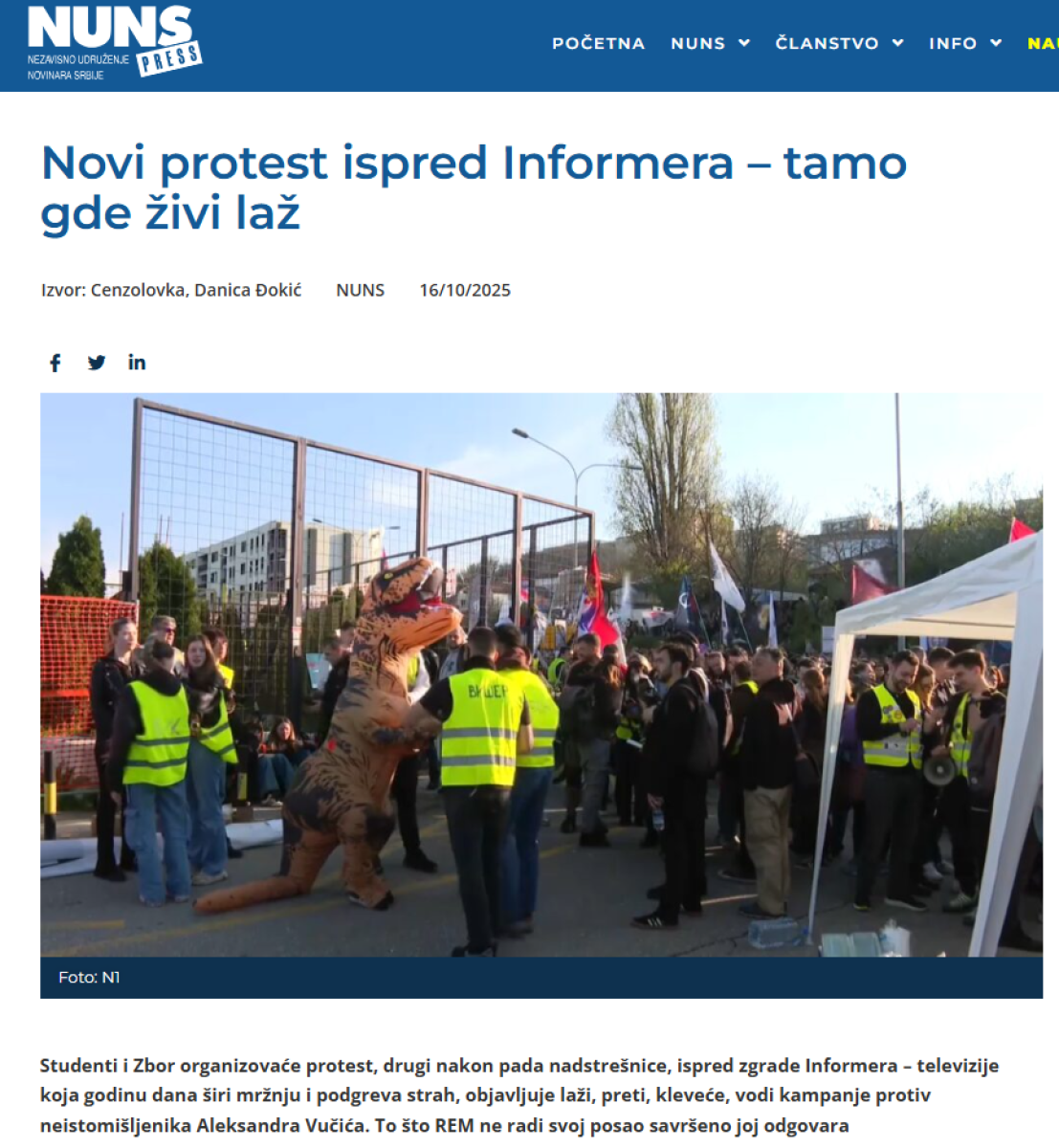 "Studenti i Zbor organizovaće protest, drugi nakon pada nadstrešnice, ispred zgrade Informera - televizije koja godinu dana širi mržnju i podgreva strah, objavljuje laži, preti, kleveće, vodi kampanje protiv neistomišljenika Aleksandra Vučića. To što REM ne radi svoj posao savršeno joj odgovara", sramno poručuju iz NUNS.