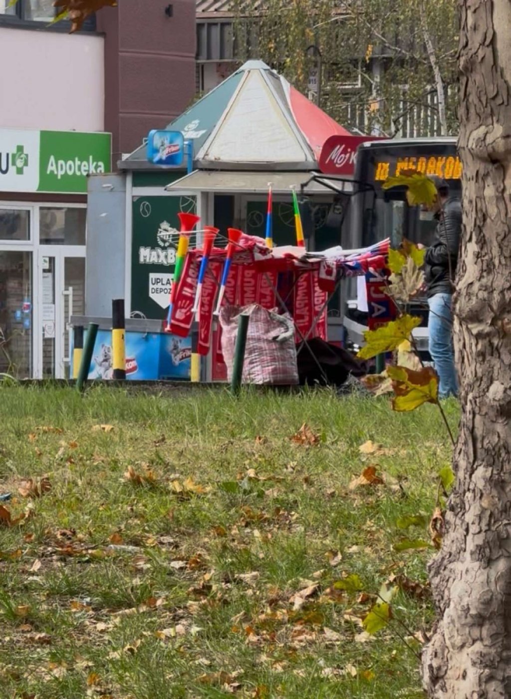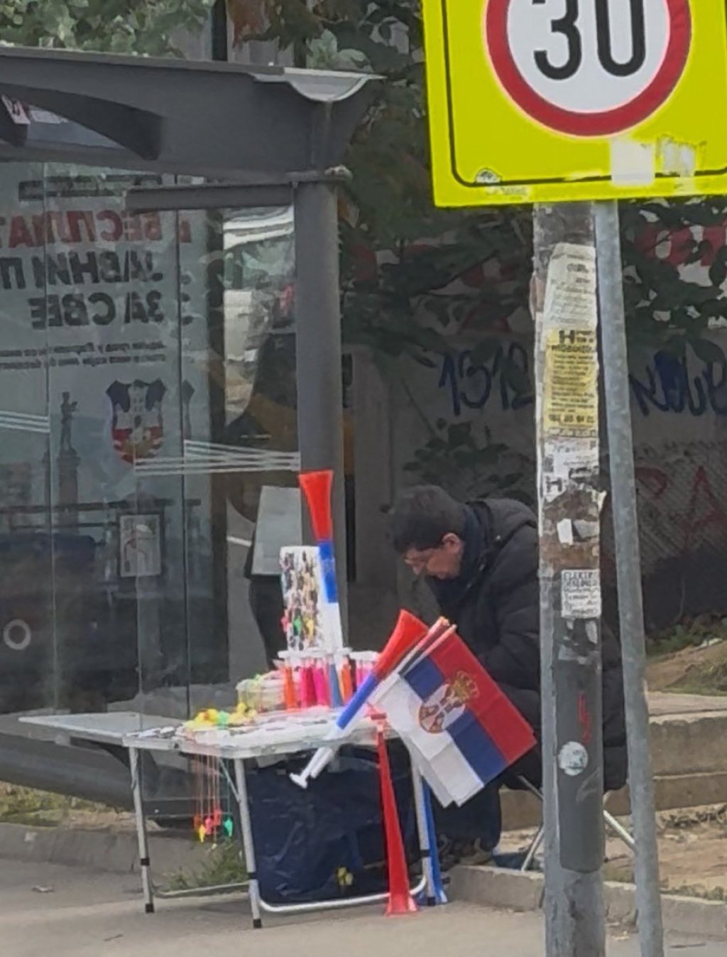 U blizini redakcije Informera, kod stanice "Darvinova", stacionirao se čovek s malom tezgom na kojoj je počela prodaja blokaderskih obeležja - bedževa, pištaljki, vuvuzela... Prodaju se i zastavice Srbije.