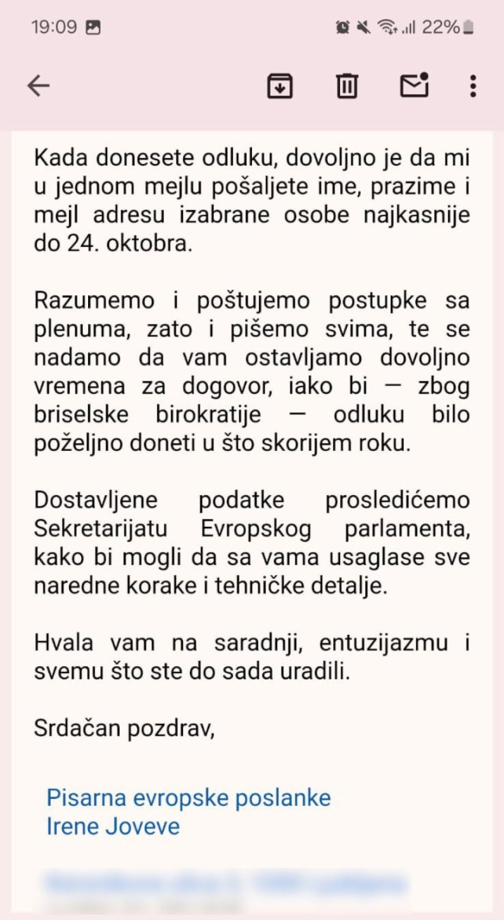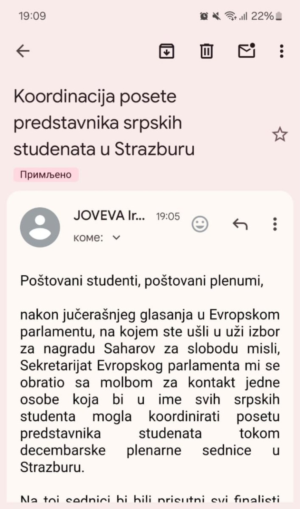 Irena Joveva, poslanica Evropskog parlamenta iz Slovenije, uputila je mejl blokaderima sa molbom da dobije adresu osobe, kojoj bi konkretno iznela plan za decembarsku plenarnu sednicu u Strazburu - a na kojoj bi ta osoba "koordinirala posetu predstavnika svih studenata".