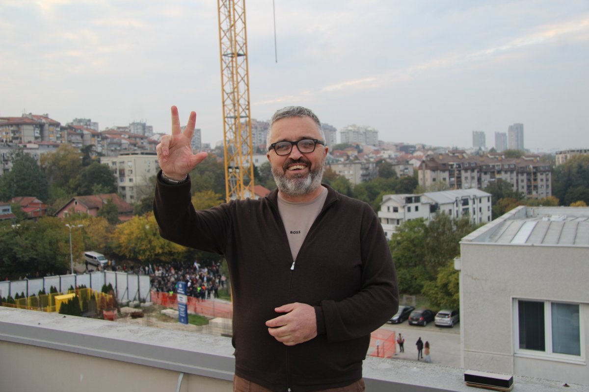 On se popeo na krov naše zgrade kako bi pozdravio sve koji su se okupili u blizini, odnosno na ulici nedaleko od nas. Ruku na srce, nije ih se mnogo pojavilo na pompezno najavljivanoj blokadi, ali ipak - ceni se Vučićevićeva želja da ih kulturno dočeka i pozdravi.