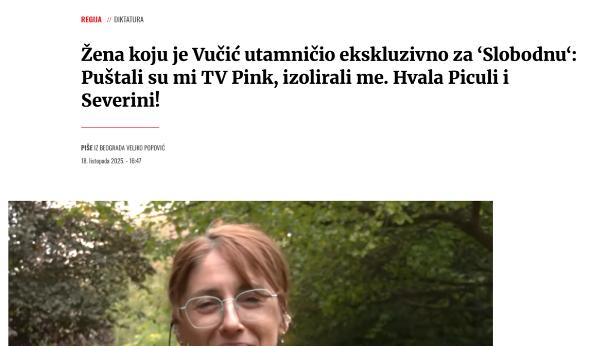 Ona je, naime, u intervjuu za "Slobodnu Dalmaciju" govorila o "paklu" kroz koji je prolazila tokom kućnog pritvora. Čini se da su joj u tom periodu najviše falili opoziciono-blokaderski mediji kao što su N1 i Nova S.