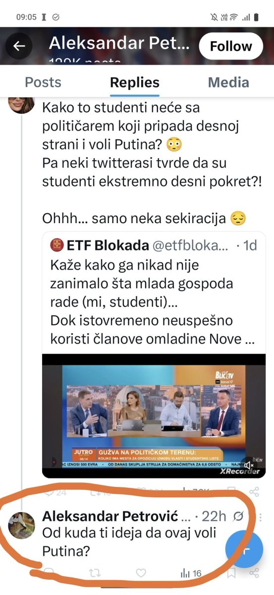 Piper je u objavi, na toj mreži, označio važan detalj - tj. komentar vozača Jovanovića, na tvrdnju da "predsednik Nove demokratske stranke Srbije voli Putina".