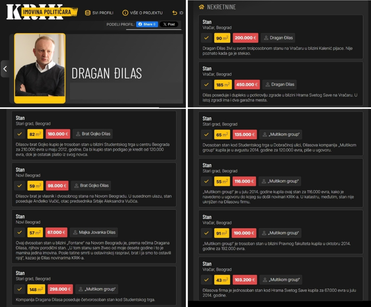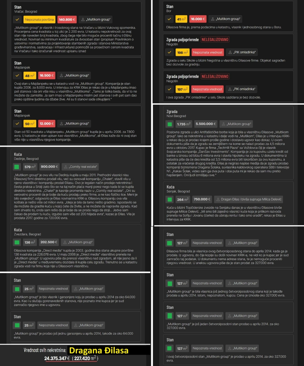 Po bazi opozicionog portala KRIK Dragan Đilas je vlasnik sledećih 16 stanova i 7 zgrada ili kuća (plus garaže, ali njih ne računam). Vrednost svih nekretnina je 24.375.347 € (24 miliona evra):