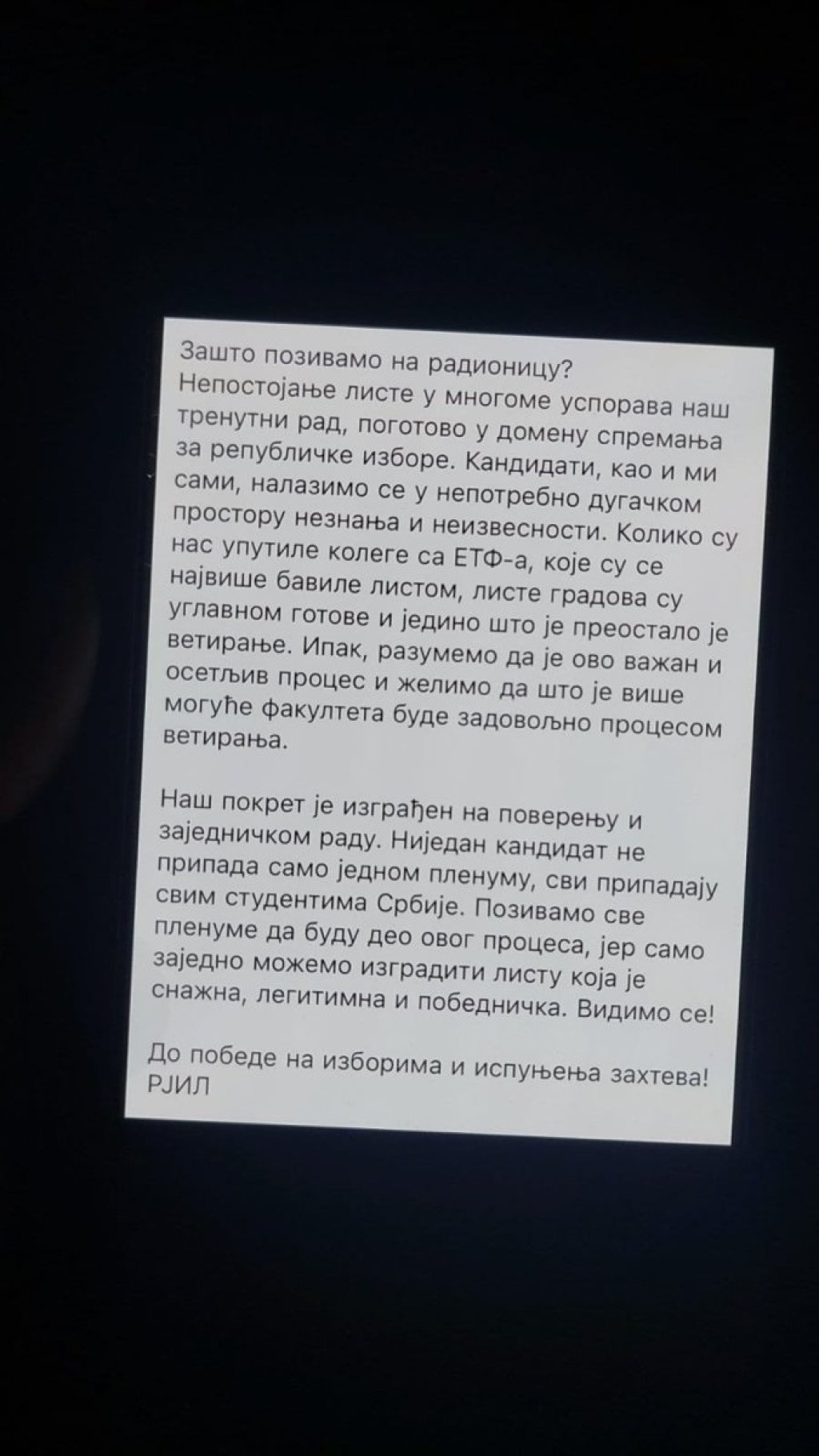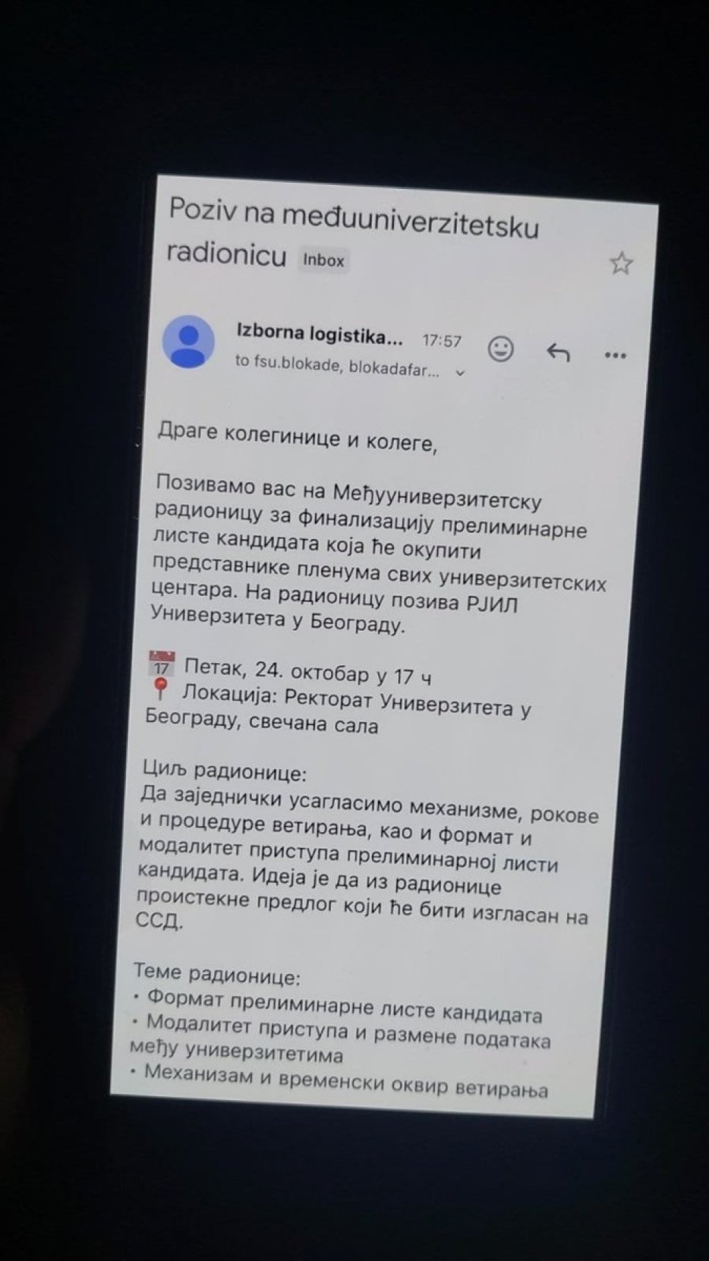 Mejl je naslovljen kao poziv za međuuniverzitetsku radionicu, a u njemu je navedeno da će se na tom događaju finalizirati preliminarna lista kandidata koja će okupiti predstavnike plenuma svih univerzitetskih centara.