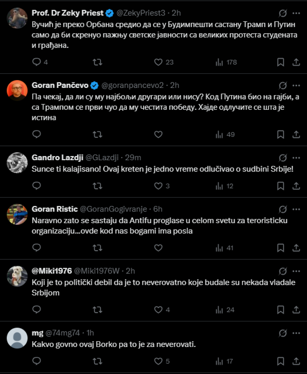To samo opozicija može tako, da lupi i da ostanu svi živi. Borko je izgovorio neverovatno glupost, da je sastanak dva najveća lidera sveta, u Budimpešti, da bi se podržao predsednik vučić. ne treba njemu podrška svetskih lidera, ima podršku svog naroda, to mu je sasvim dovoljno.