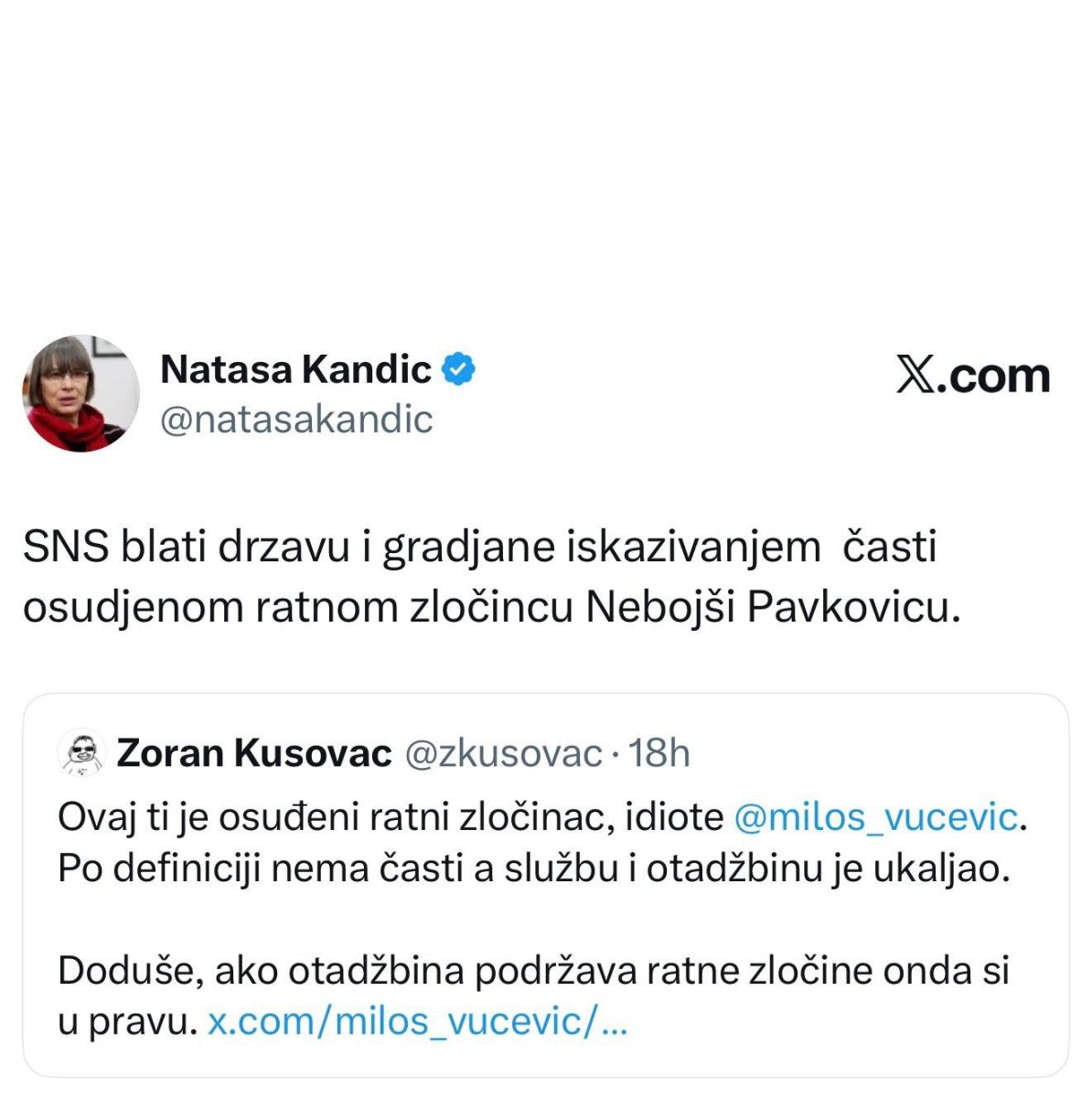 Na njegove upute žalosti, reagovao je prvo Kusovac koji je besramno izvređao Vučevića nazivajući ga idiotom koji veliča ratnog zločinca, a na taj njegov komentar se nadovezala i ko drugi nego Nataša Kandić: