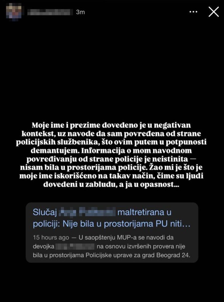 Podsetimo, studetkinja Poljoprivrednog fakulteta A. P, za koju su blokaderi tvrdili da su je pripadnici organa bezbednosti tukli nakon privođenja 24. septembra, dala je izjavu u policiji. Studentkinja je u prisustvu advokata potvrdila autentičnost Instagram naloga i njene objave na tom nalogu u kojoj demantuje da se radi o njoj, odnosno da nije povređena od strane policijskih službenika, kao i da nije bila u prostorijama policije.