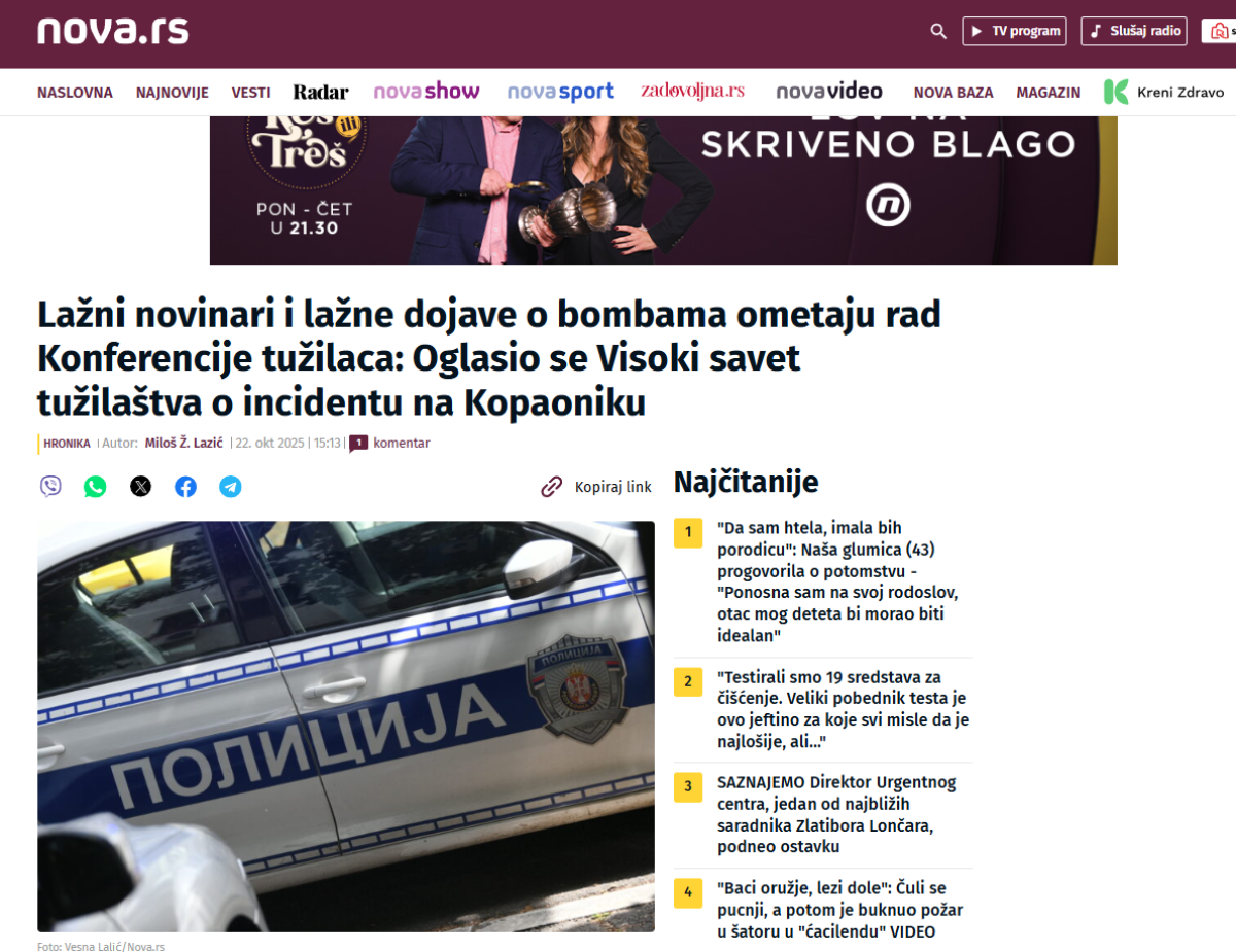 "Opstrukcija rada konferencije je kulminirala u večernjim časovima 21. oktobra 2025. godine, kada je u tom momentu neidentifikovano lice uputilo pretnje da je na mestu održavanja konferencije postavljena bomba koja će u neposrednom vremenskom periodu detonirati. Zbog upućene pretnje svi učesnici konferencije su evakuisani do sprovođenja kontra-diverzione provere i zaštite. Pripadnici specijalizovanih službi MUP-a su momentalno reagovali i provera i zaštita je obavljena u izuzetno kratkom roku, te je utvrđeno da je prijava bila lažna", navode oni i dodaju detalje o hapšenju muškarca koji je odgovoran za ovo krivično delo:
