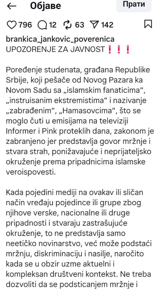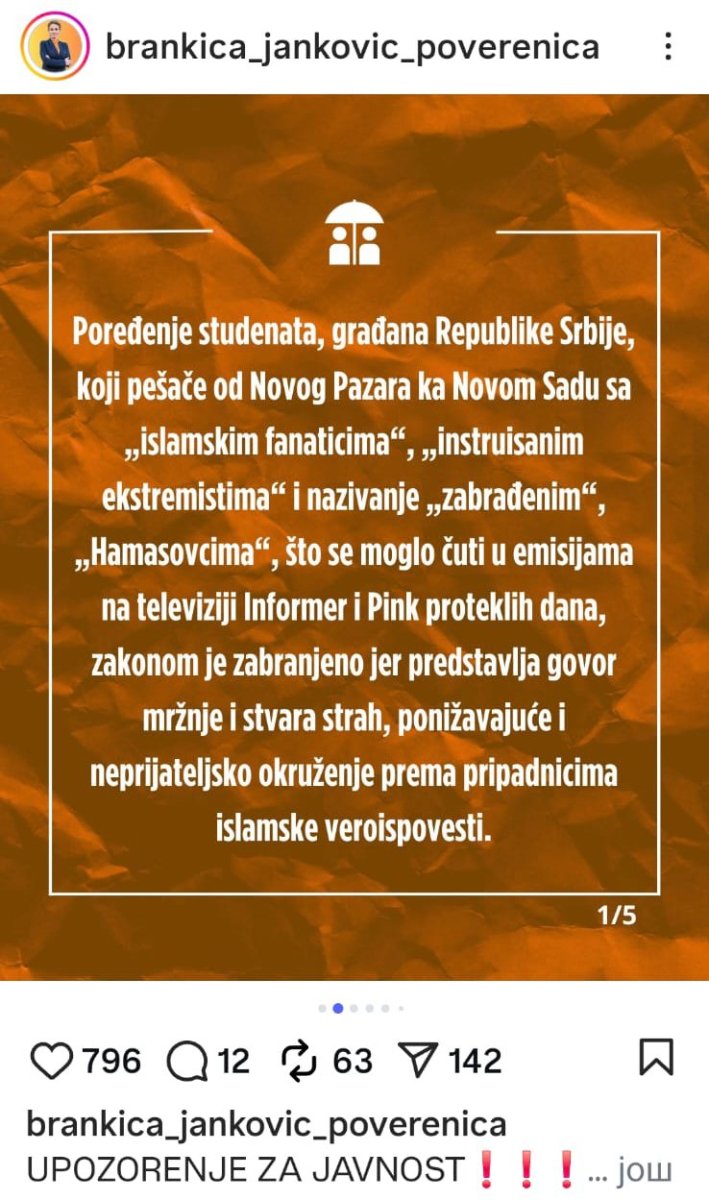 ''Poređenje studenata, građana Novog Pazara koji pešače od Novog Pazara do Novog Sada sa ''islamskim fanaticima'', ''instruisanim ekstremistima'' i nazivanje ''Hamasovcima'' što se moglo čuti u emisijima na televiziji Pink i Informer proteklih dana, zakonom je zabranjeno jer predstavlja govor mržnje i stvara strah'', napisala je, između ostalog, Jankovićeva.
