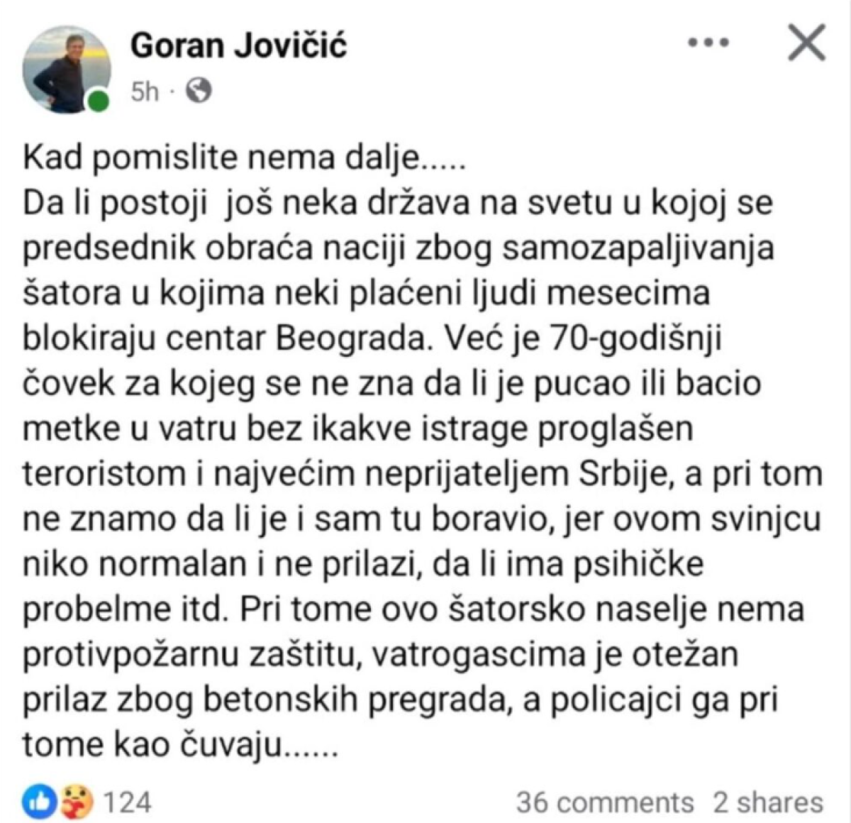 - Da li postoji još neka država na svetu u kojoj se predsednik obraća naciji zbog samozapaljivanja šatora u kojima neki plaćeni ljudi mesecima blokiraju centar Beograda. Već je 70-godišnji čovek za kojeg se ne zna da li je pucao ili bacio metke u vatru bez ikakve istrage proglašen teroristom i najvećim neprijateljem Srbije, a pri tom ne znamo da li je i sam tu boravio, jer ovom svinjcu niko normalan i ne prilazi, da li ima psihičke probelme itd. Pri tome ovo šatorsko naselje nema protivpožarnu zaštitu, vatrogascima je otežan prilaz zbog betonskih pregrada, a policajci ga pri tome kao čuvaju - objavio je Jovičić, šef dopisništva RTS u Pančevu i time diskreditovao i sebe kao novinara, ali i RTS.