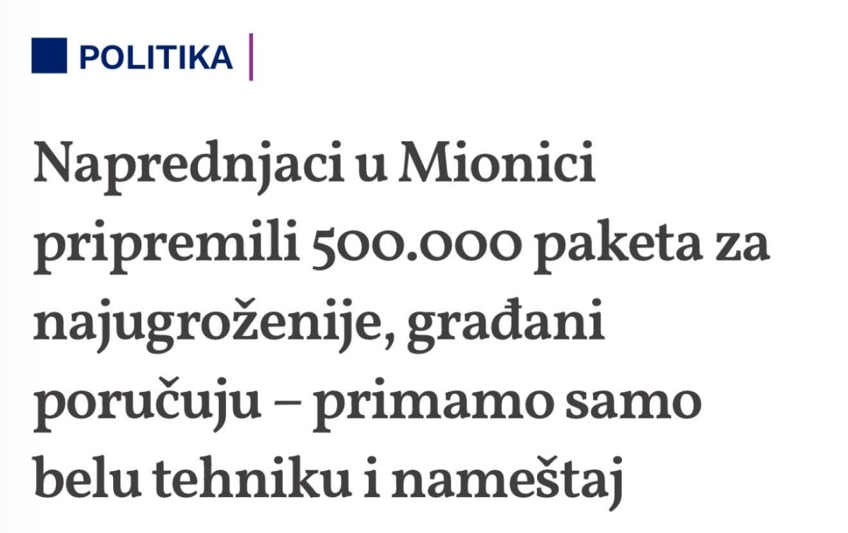 Naime na opozicionim medijima se pojavila vest "Naprednjaci u Mionici pripremili 500.000 paketa za najugroženije, građani poručuju - primamo samo belu tehniku i nameštaj".
