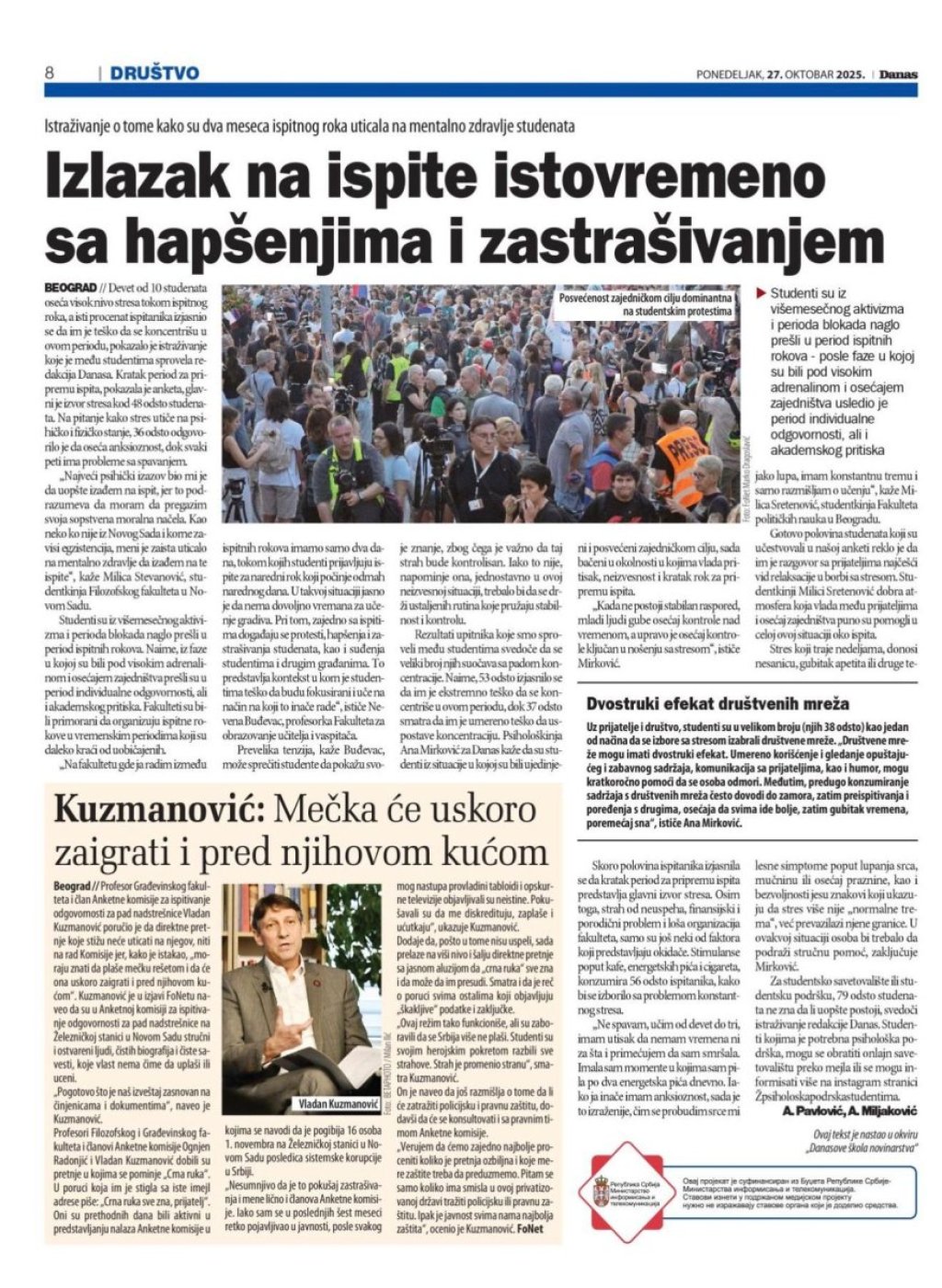 Tajkunski Danas je u svom današnjem izdanju objavio tekst s naslovom "Izlazak na ispite istovremeno sa hapšenjima i zastrašivanjem", koji se bazira na istgraživanju sprovedenom u redakciji ovog medija.