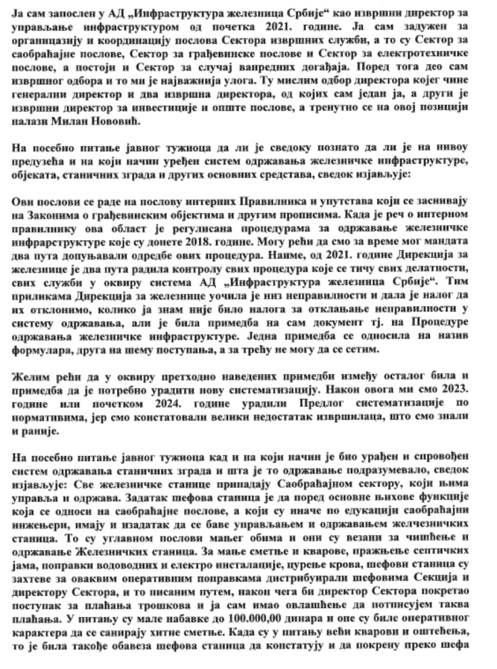 - U svedočenju pred VJT Novi Sad (strana 2, pasus 2) Milutin Milošević, tada još uvek izvršni direktor, rekao je da je zadužen za "organizaciju i koordinaciju Sektora izvršnih službi, a to su Sektor za saobraćajne poslove, Sektor za građevinske poslove i Sektor za elektrotehničke poslove a postoji i Sektor za slučaj vanrednih događaja". Na istoj stranici 2, u pasusu 6, Milutin Milošević priznaje da "sve železničke stanice pripadaju Saobraćajnom sektoru koji njima upravlja i održava". Kako je, po sopstvenom priznanju, Milošević bio šef Saobraćajnom sektoru jasno je da je bio nadležan za upravljanje i održavanje železničkih stanica pa i one u Novom Sadu - otkrio je Mrdić.