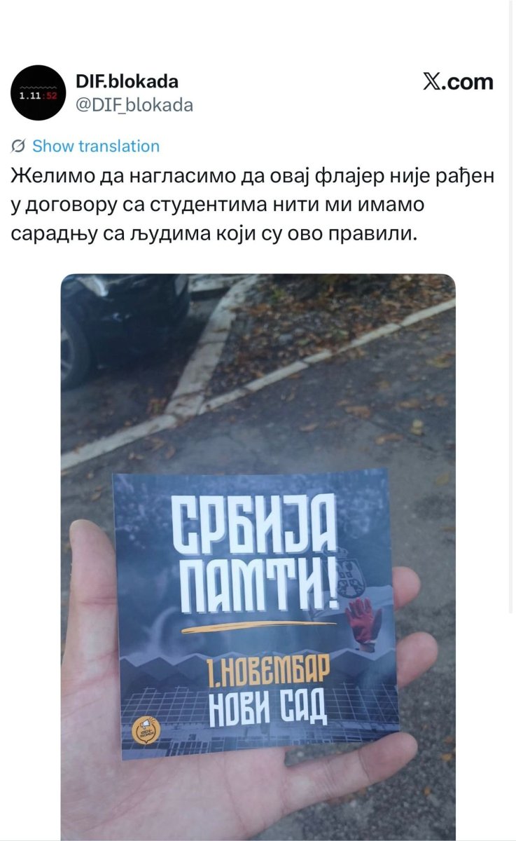 "Zašto, ekipo iz Kreni-Promeni, pokušavate da svojatate komemorativni skup? Zašto snimke naših i zborskih akcija postavljate i indirektno predstavljate kao svoje akcije? Ako zaista nesebično podržavate, zašto stavljate svoj logo na pozivnicu?", pitaju blokaderi sa Fakulteta političkih nauka.
