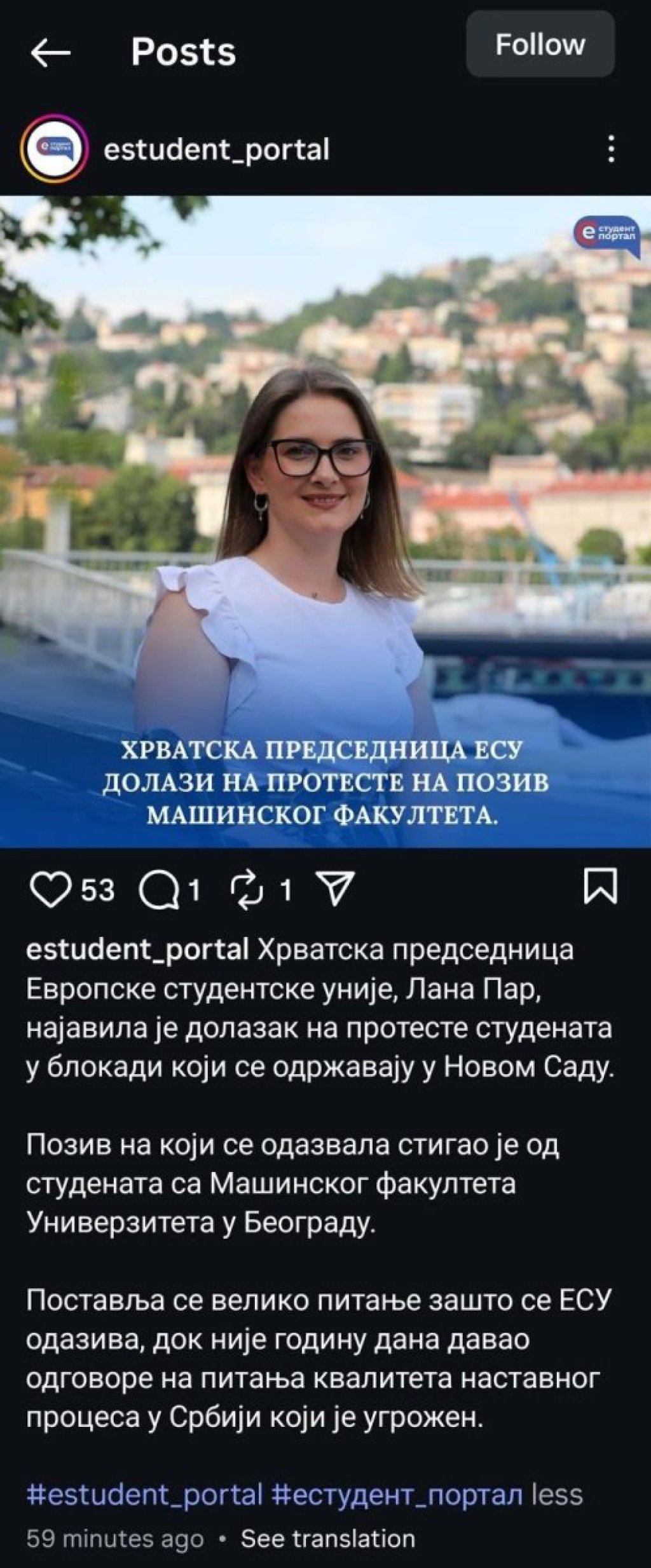 - Postavlja se pitanje zašto se ESU odaziva, dok nije godinu dana davao odgovore na pitanja kvaliteta nastavnog procesa u Srbiji koji je ugrožen - stoji u objavi na Instagram stranici estudent_portal.