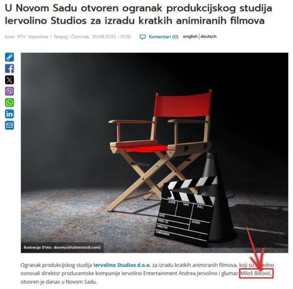 Reč je o studiju Jervolino (Iervoliono studios), koji je Biković otvorio zajedno sa Italijanom Andreom Jervolinom kog je doveo u Srbiju. Tom prilikom je dolazio na pregovore kod predsednika Srbije Aleksandra Vučića i dobio milione za taj projekat, da bi se sada najstrašnije ostrvio na lidera naše zemlje baš kao što je učinio i njegov kolega Dragan Bjelogrlić.
