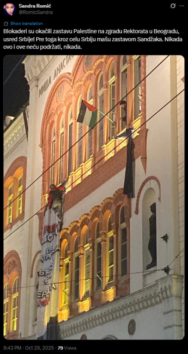 "Blokaderi su okačili zastavu Palestine na zgradu Rektorata u Beogradu, usred Srbije! Pre toga kroz celu Srbiju mašu zastavom Sandžaka. Nikada ovo i ove neću podržati, nikada".