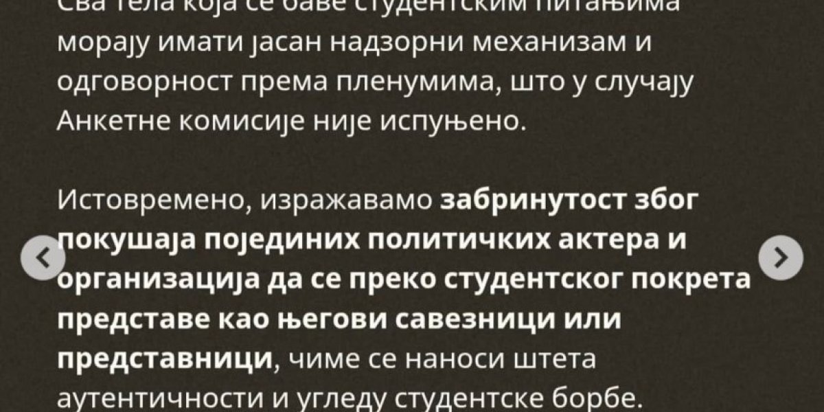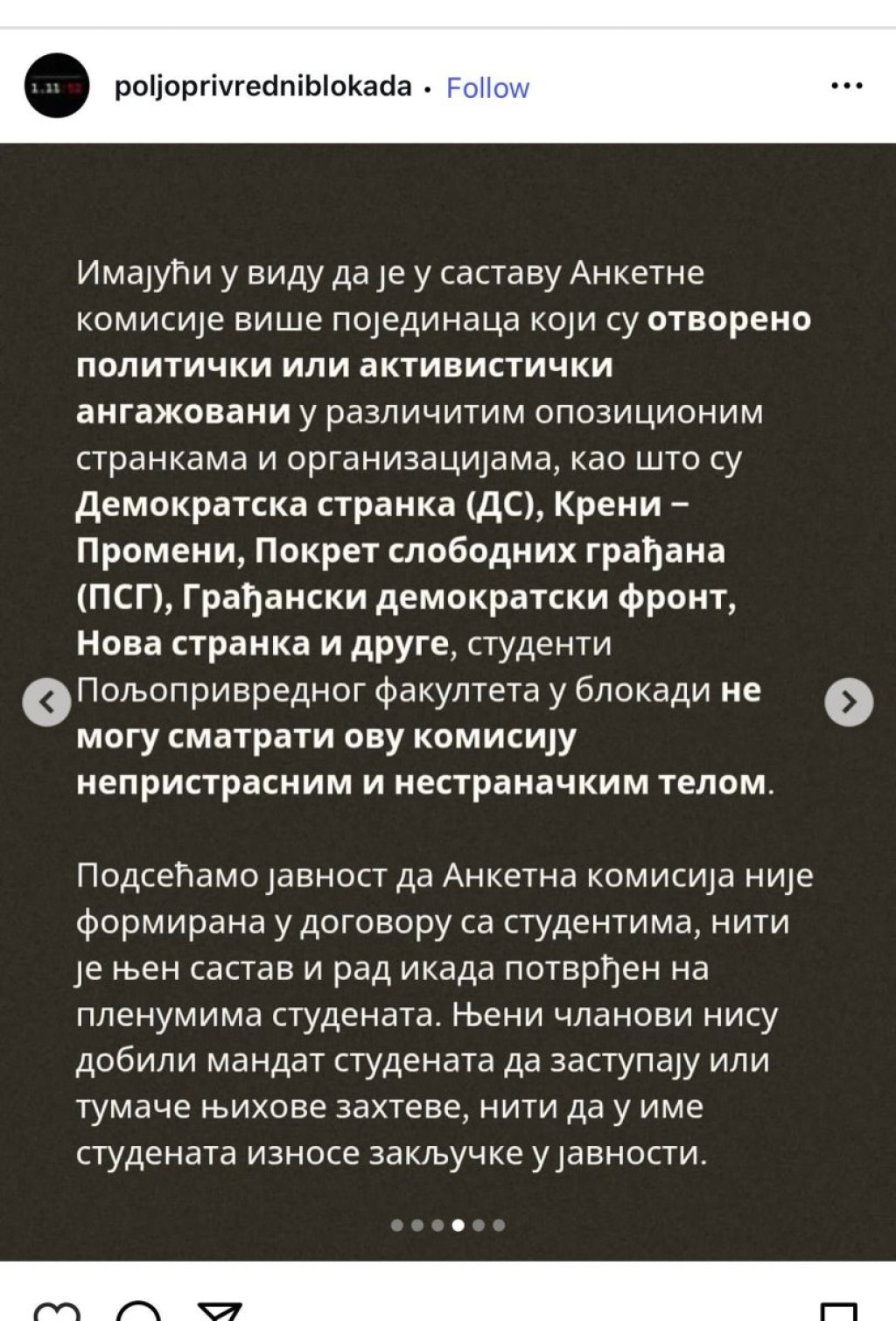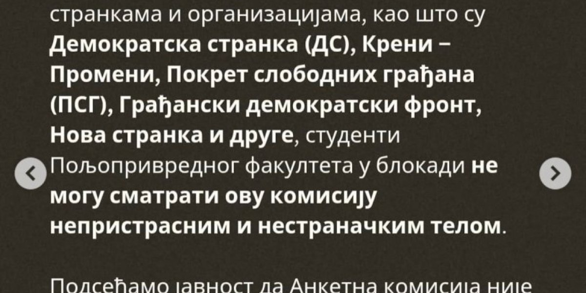 Blokaderi sa Filozofskog fakulteta u Beogradu poručuju da će 1. novembra tzv. Anketna komisija pokušati da donese zaključak o padu nadstrešnice u Novom Sadu na železničkoj stanici - naglašavajući da se oni od takvih radnji ograđuju.