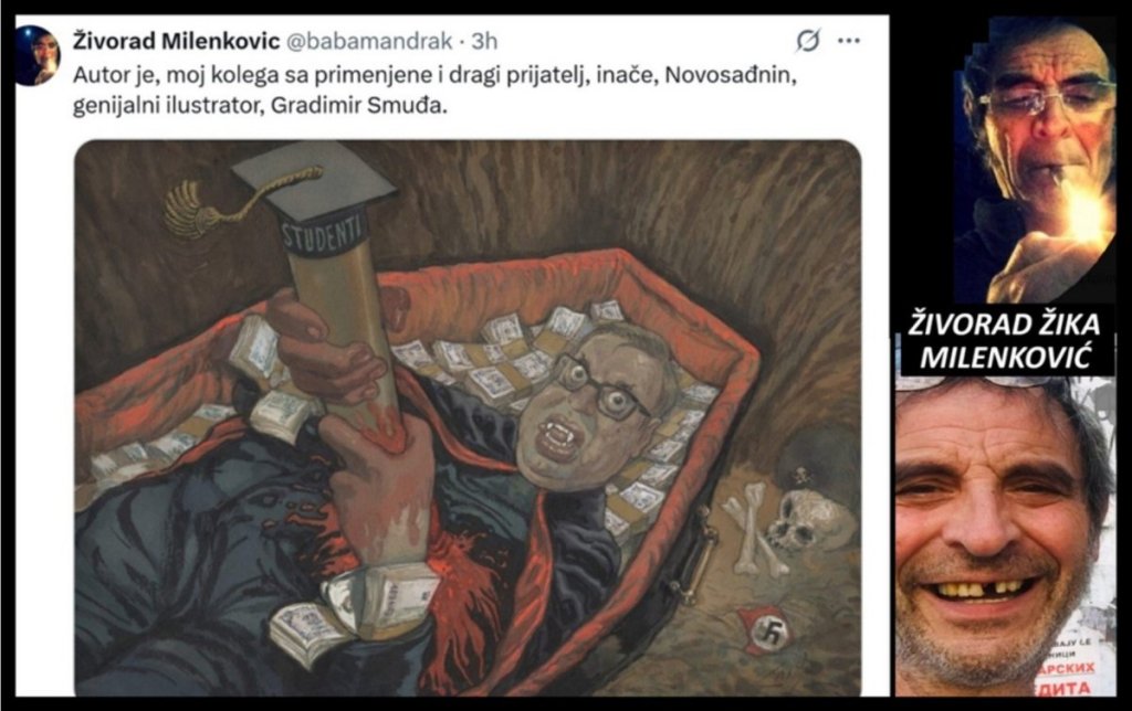 Najoštrije osuđujem monstruozne pretnje smrću predsedniku Vučiću, koje su 31.10.2025. uputili blokader Živorad Žika Milenković, muzičar i član grupe Bajaga i instruktori, i izvesni „ilustrator“ Gradimir Smuđa. Blokader Živorad Žika Milenković je na društvenoj mreži Iks, objavio sramnu ubilačku sliku, ilustraciju predsednika Srbije Aleksandra Vučića probodenog kocem, na kome piše „studenti“. Predsednik Vučić je predstavljen kao Grof Drakula u smrtnom grču, obliven krvlju, koji leži u mrtvačkom kovčegu, na gomili novca, pored kostiju i nacističkog kukastog krsta. Blokader Živorad Žika Milenković nije objavio ove pretnje smrću, baš slučajno danas, 31.10.2025. Objavio je to namerno kao deo „pumpanja“ i pozivanja na nasilje, krvavu obojenu revoluciju i građanski rat, koji opozicija i blokaderi pripremaju za sutra, za 1. 11. 2025., na godišnjicu strašne nesreće izazvane greškom i nemarom struke.