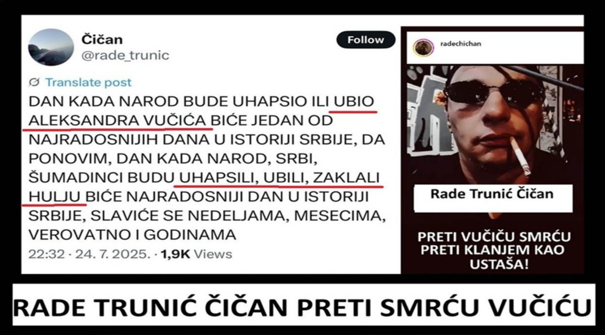 Setimo se da je 25.07.2025. jedan od lidera i ideologa opozicije, Rade Trunić Čičan, na platformi Iks objavio monstruozne pretnje smrću predsedniku Srbije, Aleksandru Vučiću: „Dan kada narod bude uhapsio ili ubio Aleksandra Vučića biće jedan od najradosnijih dana u istoriji Srbije, da ponovim, dan kada narod, Srbi, Šumadinci, budu ubili, zaklali hulju biće najradosniji dan u istoriji Srbije, slaviće se nedeljama, mesecima, verovatno i godinama“. Koliko znam nije bilo reakcije tužilaštva.