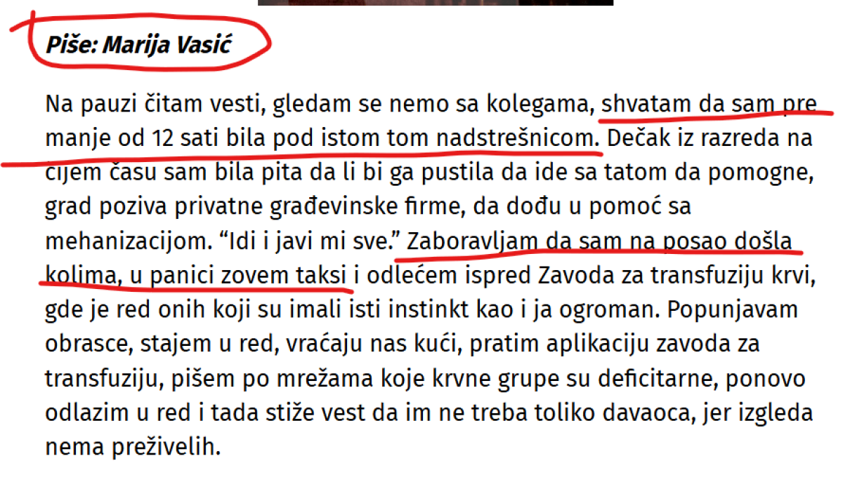 „Na pauzi čitam vesti, gledam se nemo sa kolegama, shvatam da sam pre manje od 12 sati bila pod istom tom nadstrešnicom. Dečak iz razreda na čijem času sam bila pita da li bi ga pustila da ide sa tatom da pomogne, grad poziva privatne građevinske firme, da dođu u pomoć sa mehanizacijom. “Idi i javi mi sve.” Zaboravljam da sam na posao došla kolima, u panici zovem taksi.“