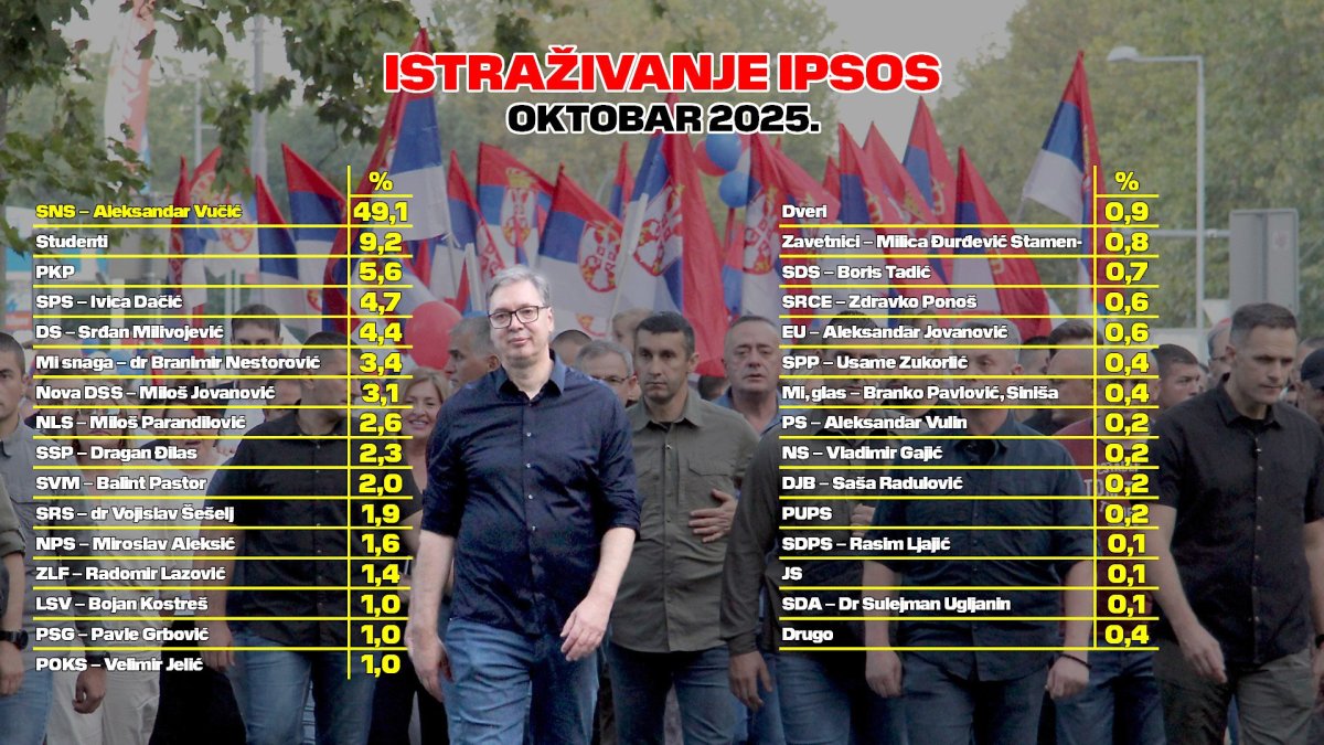 U video-zapisu su, podsetimo, korišćeni podaci iz istraživanja agencije Ipsos, koji su objavljeni 29. oktobra. Prema njima, da se parlamentarni izbori u Srbiji održavaju danas, 2. novembra, lista SNS Aleksandra Vučića osvojila bi 49,1 odsto glasova, dok bi tzv. "studentska lista" dobila 9,2 procenata podrške građana. Prema Ipsosu, cenzus (3 odsto) prešli bi i u parlament ušli još: