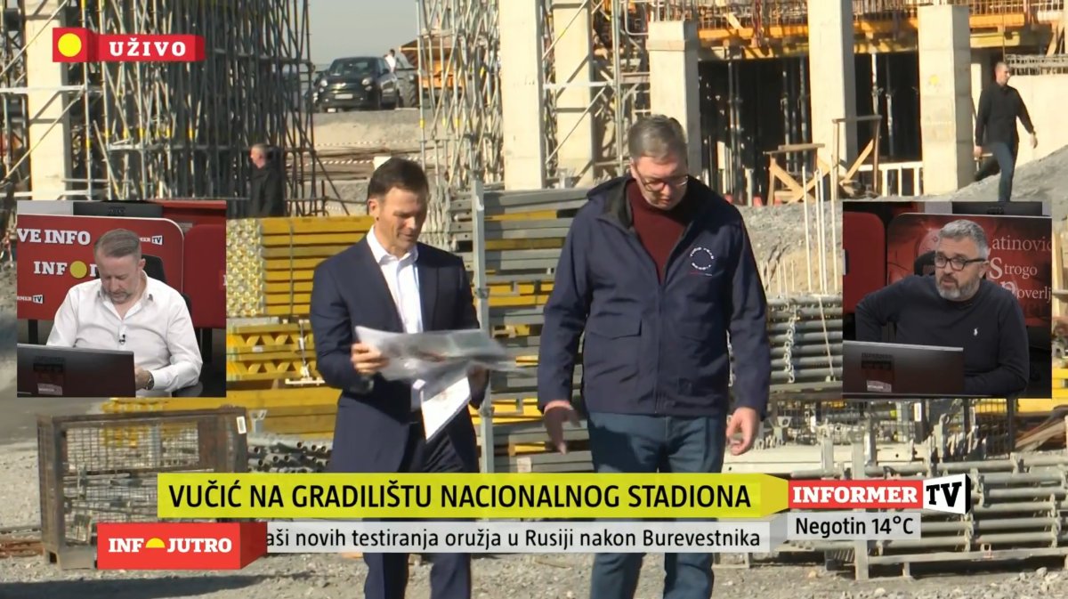 - Mnogo sam srećan što se nalazimo danas ovde na Nacionalnom stadionu, iza mene je južna tribina... Veliki su pomaci, mnogo truda, rada, znanja je uloženo, samo šipova ima 2.448, ljudi rade u dve smene, 100.000 kubika betona, 5.000 ljudi radi ovde na gradilištu, Ekspo stanovi idu brže od roka, a sam Ekspo malo kasni, jedino kasnimo sa Nacionalnim stadionom i nadam se da ćemo završiti do 28. februara 2027, a što se tiče utakmica od septembra 2027 - rekao je predsednik Srbije.