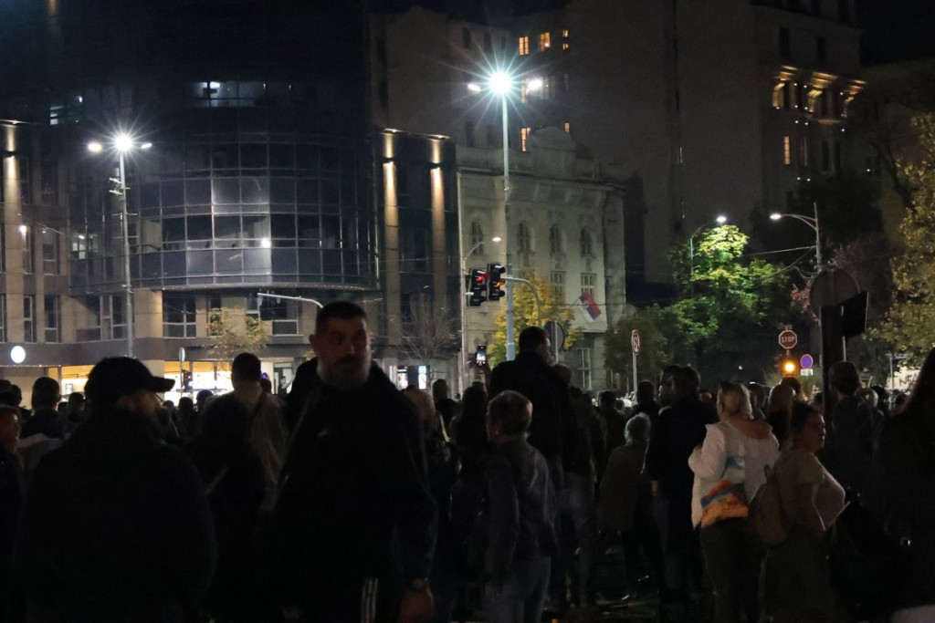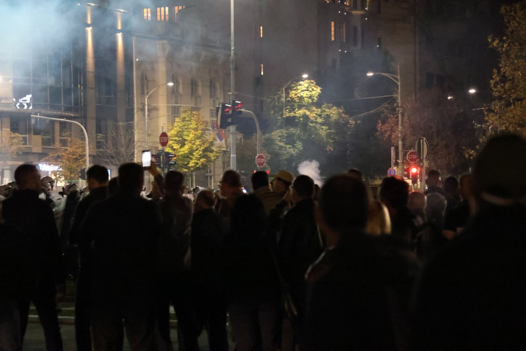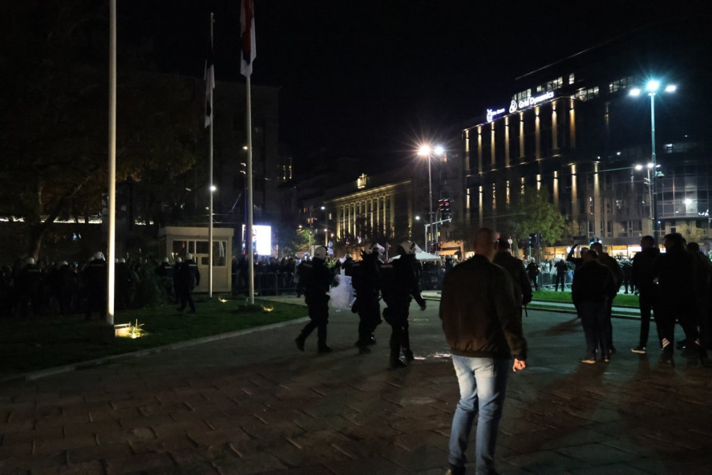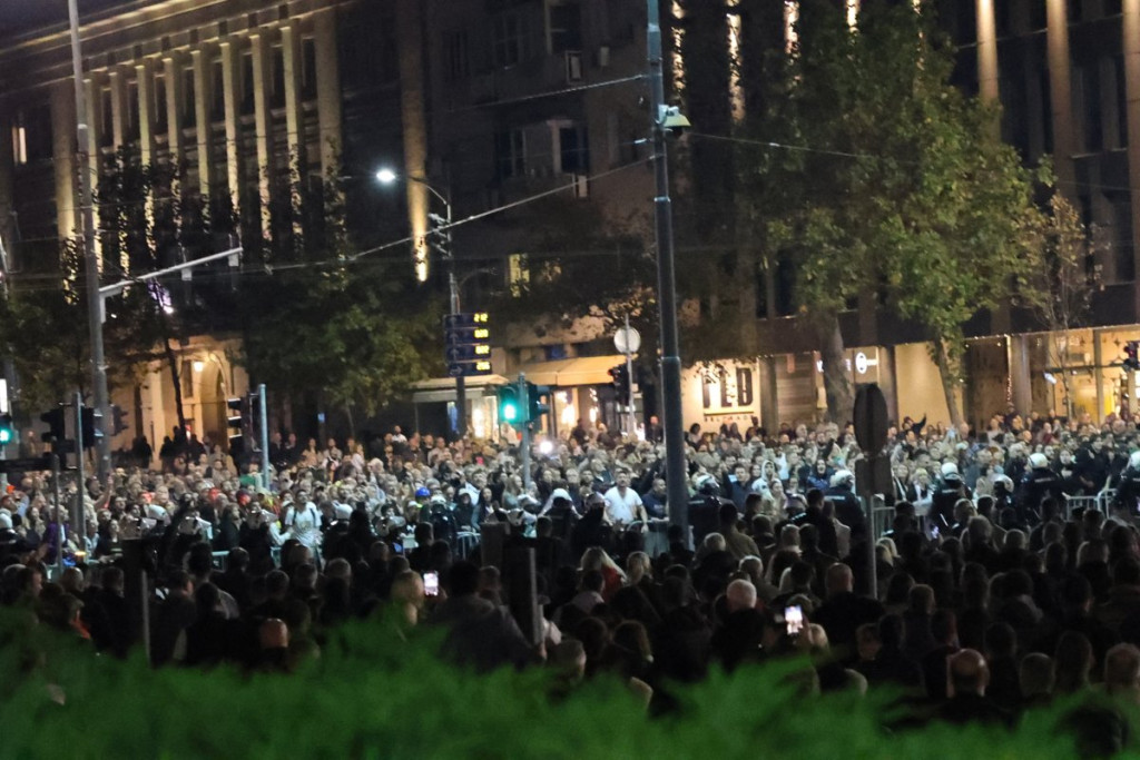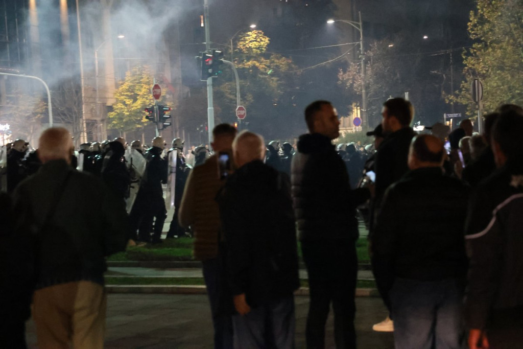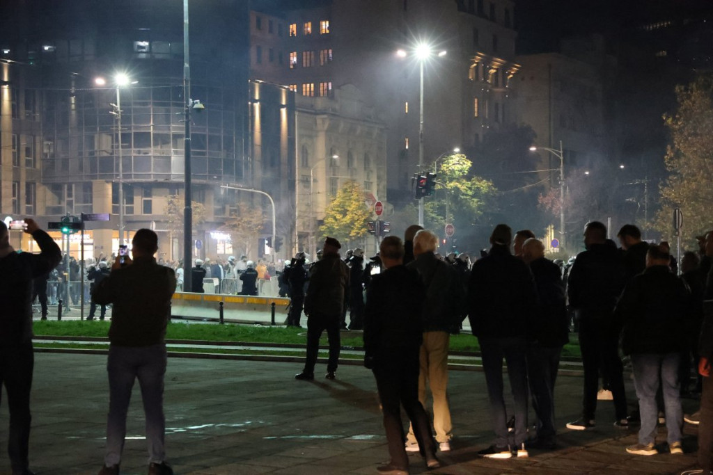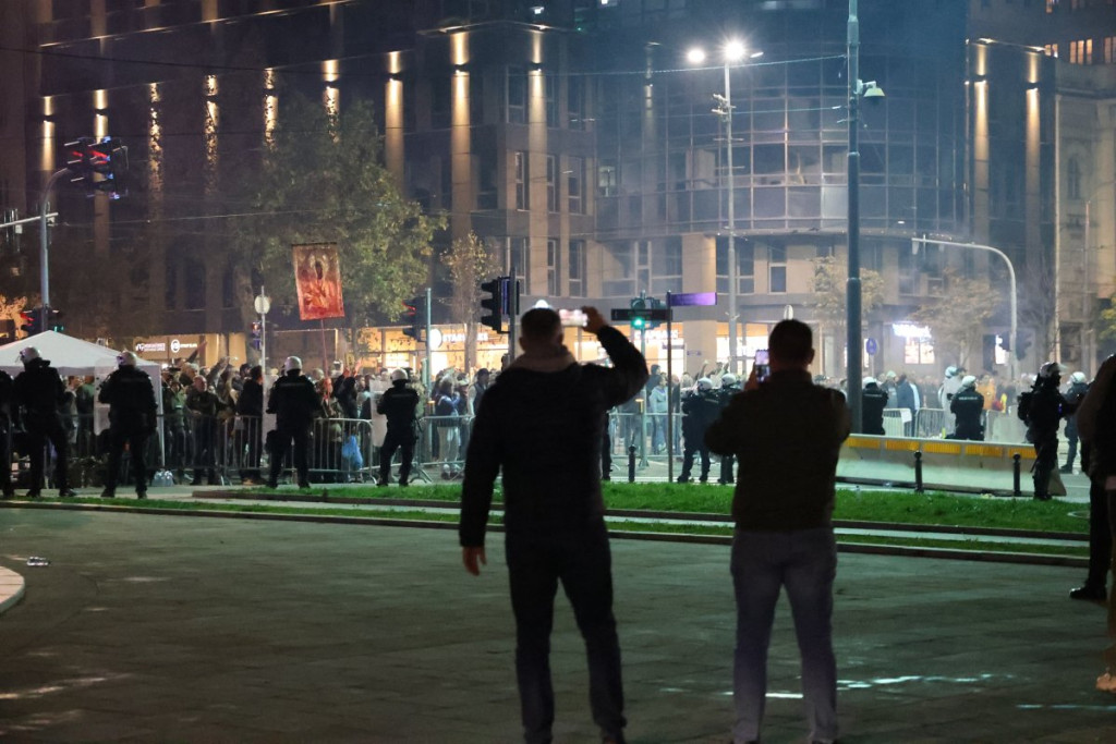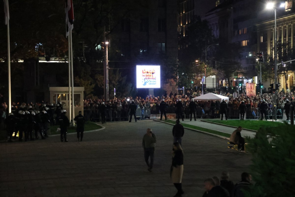 - Grupa iza ograde skače i viče: "Ko ne skače taj je ćaci", na samom platou je i puno simpatizera SNS. Policija je zamolila da ljudi više ne prelize, jer postoji mogućnost da blokaderi planiraju da bace porotehnička sredstva. Pojačane su mere bezbednosti.
