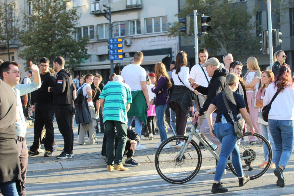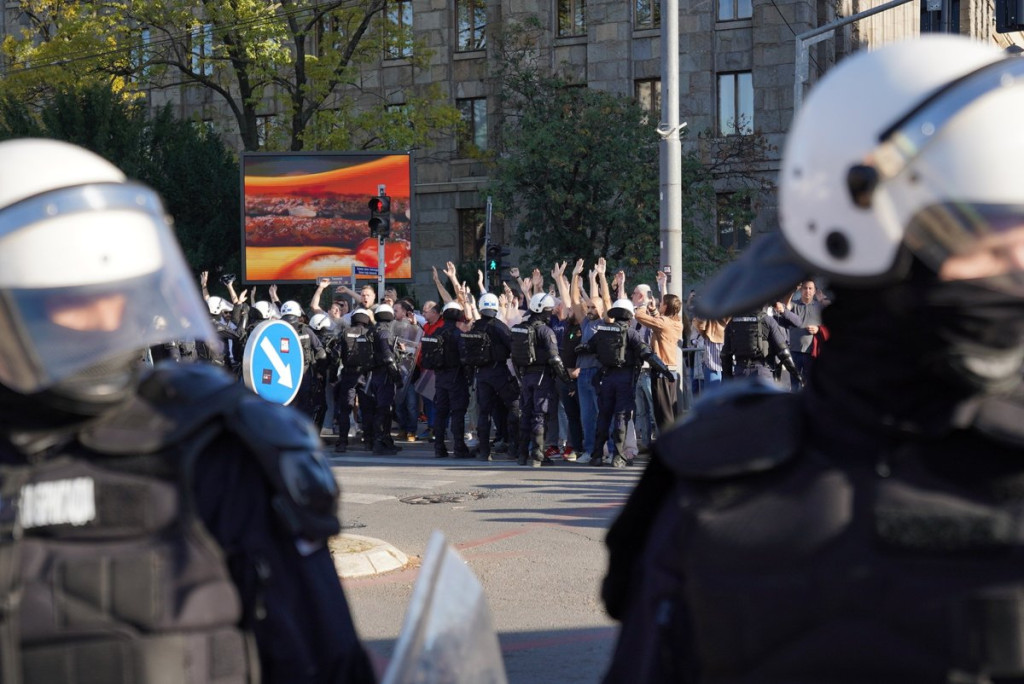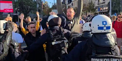Jedna od perjanica nasilnih blokadera, Vladimir Štimac nasrće na policiju, diže ruke i pokušava da probije kordon sve vreme vičući ljudima da mu se pridruže.
