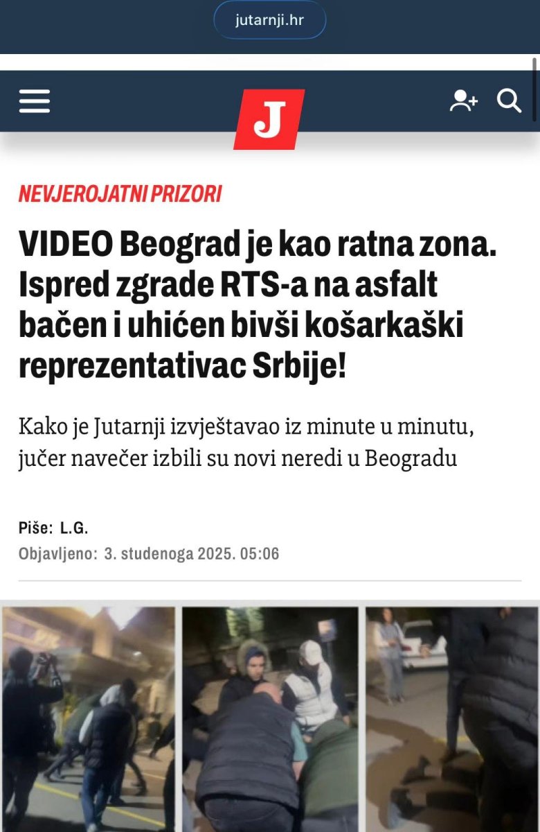 "Jutarnji list", jedan od vodećih medija u komšiluku objavio je tekst pod naslovom "Beograd kao ratna zona. Ispred zgrade RTS-s na asfalt bačen i uhapšen bivši košarkaški reprezentativac Srbije!"