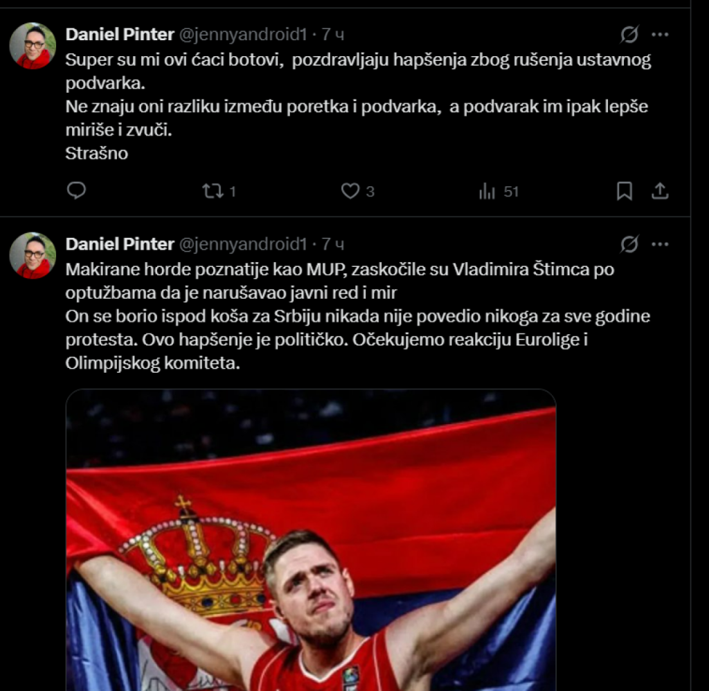 Nakon što su se blokaderi zahvalili Hrvatima za podršku, zašto ne bi i Danijelu Pinteru, za razliku od Hrvata koji su pobili bar milion Srba, bivši voditelj dnevnika na RTS-u nije još nikoga ubio, ali je zato upućivao lažne dojave o bombama u srpskim školama.