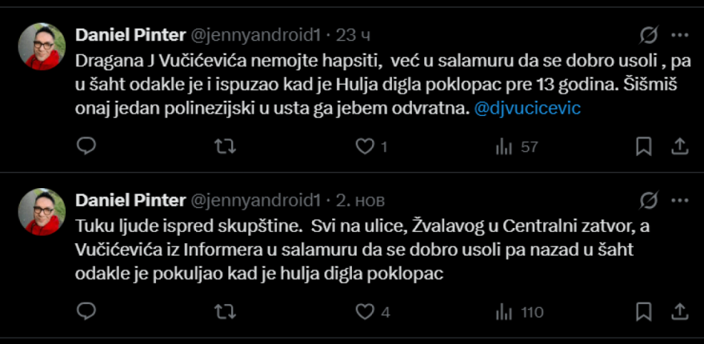 Ako je suditi po njegovim objavama na društvenim mrežama, reč je o čoveku koji ne poznaje granice pristojnosti. Njegov rečnik pun je vulgarnosti, ličnih uvreda i poziva na mržnju. Na meti su mu svi, od novinara i političara do običnih građana. Javni prostor koristi kao platformu za ispoljavanje mržnje, pretnji i prostakluka.