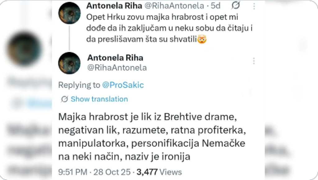 - Majka hrabrost je lik iz Brehtove drame, negativan lik, razumete, ratna profiterka, manipulatorka, personifikacija Nemačke na neki način, naziv je ironija - napisala je ona.