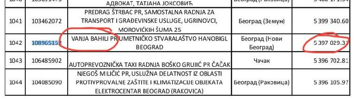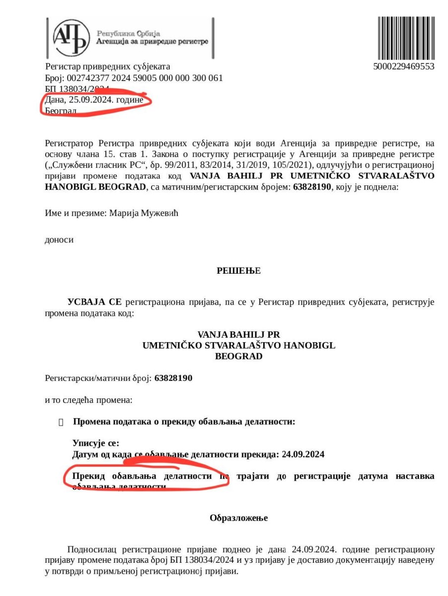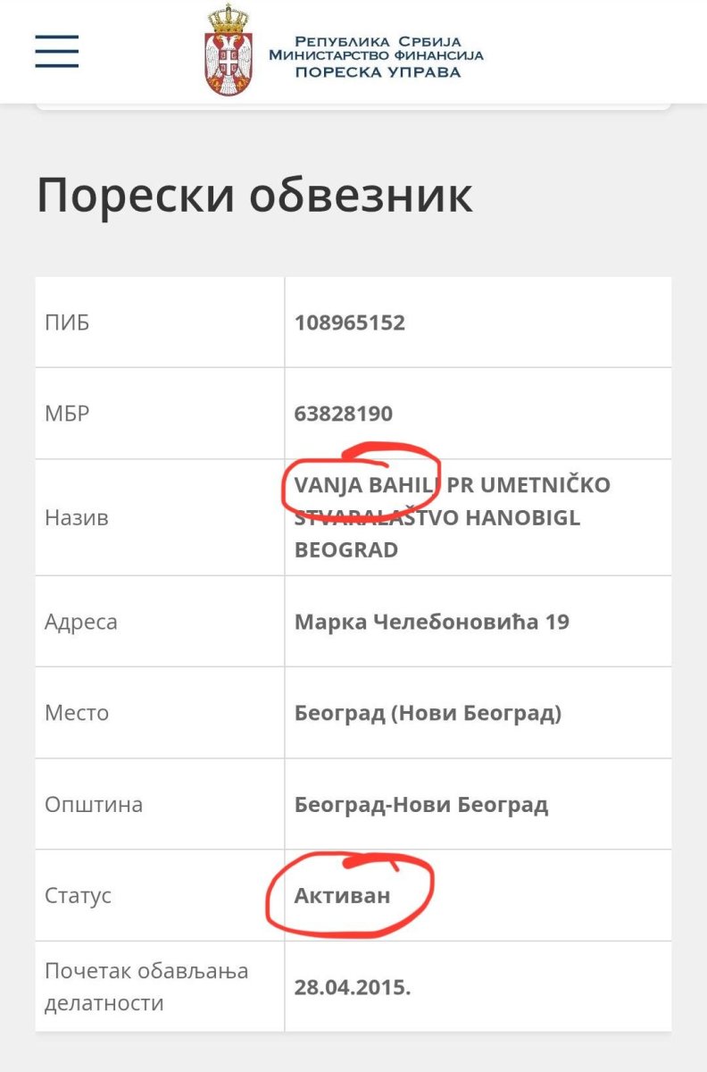 Prema podacima koji se mogu naći na sajtu Poreske uprave može se videti da firma pod nazivom Vanja Bahilj PR Umetničko Stvaralaštvo Hanobigl Beograd ponovo posluje - nakon što je njen rad bio obustavljen zbog duga od 5.397.029 dinara.