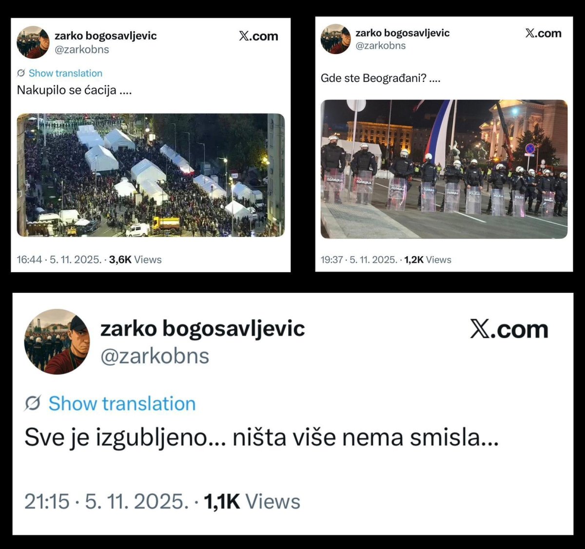 "Nakupilo se ćacija", "Gde ste Beograđani", "Sve je izgubljeno, ništa više nema smisla", napisao je Bogosavljević".