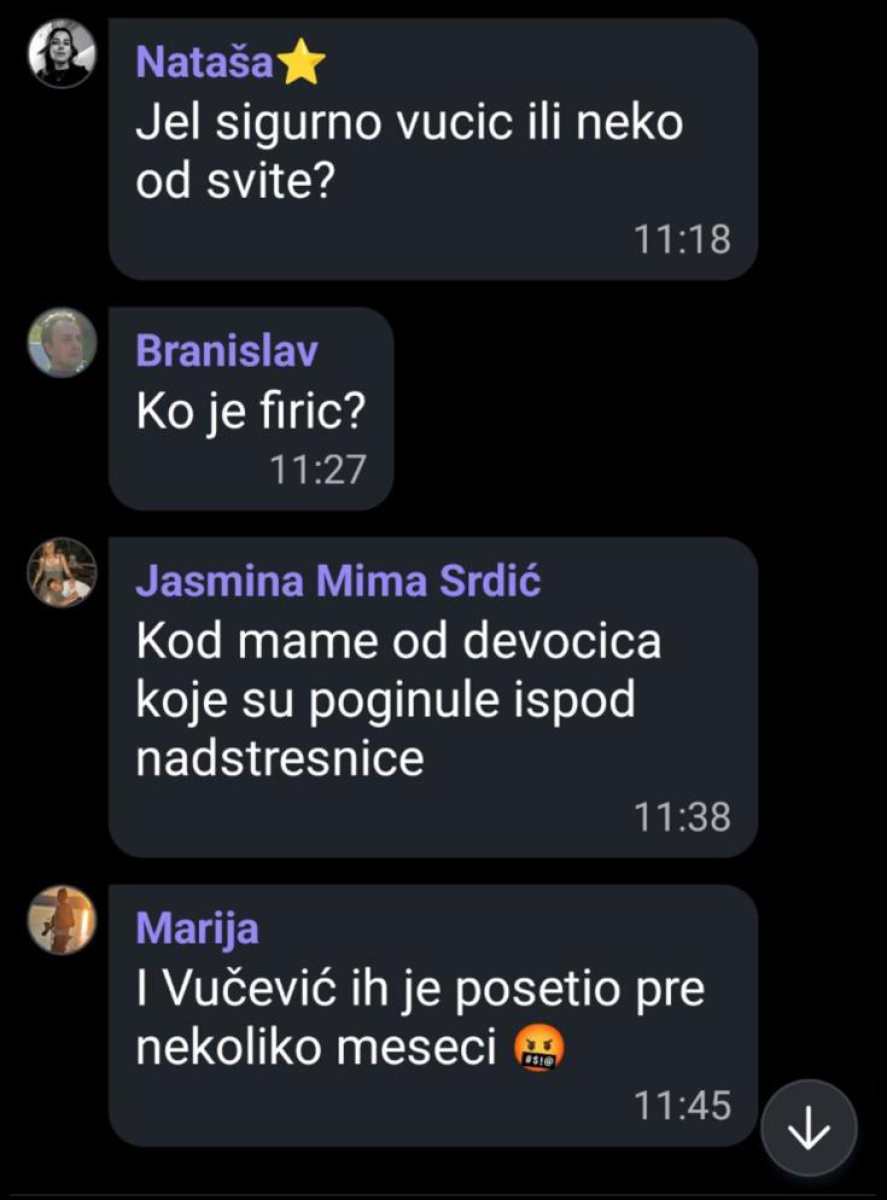 Kako se navodi u blokaderskim grupama koje objavljujemo, predsednik Srbije Aleksandar Vučić otišao je u Novi Sad i u naselju Klisa posetio porodicu Firić - najstradaliju porodicu koja je ostala bez devojčica Sare i Valentine i dede Đorđa.