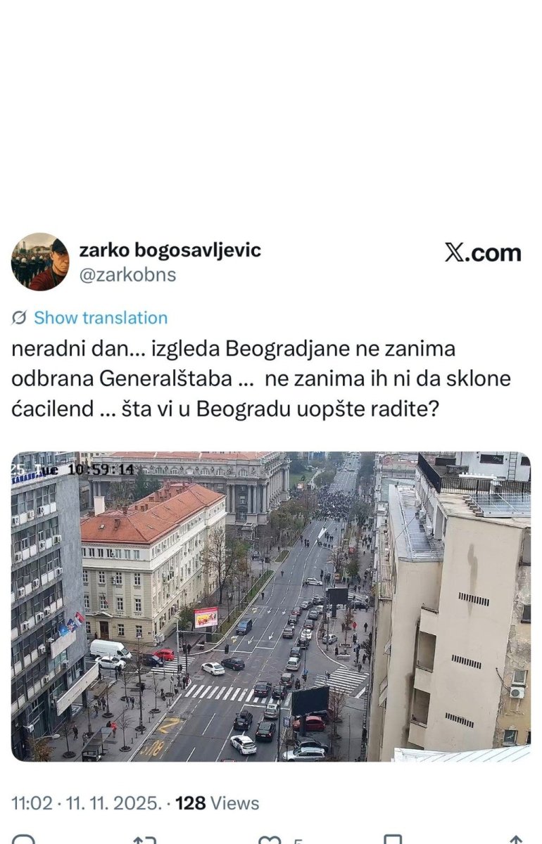 - Neradni dan, izgleda da Beograđane ne zanima odbrana Generalštaba, ne zanima ih ni da sklone Ćacilend, šta vi u Beogradu uopšte radite? - napisao je Bogosavljević.