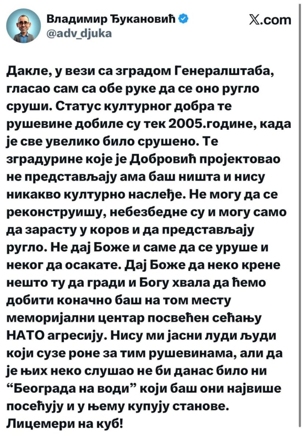 - Bogu hvala da ćemo dobiti konačno baš na tom mestu memorijalni centar posvećen sećanju na NATO agresiju. Nisu mi jasni ljudi koji suze rone za tim ruševinama, ali da je njih neko slušao ne bi danas bilo ni "Beograda na vodi" koji baš oni najviše posećuju i u njemu kupuju stanove. Licemeri na kub! - zaključio je Vladimir Đukanović.