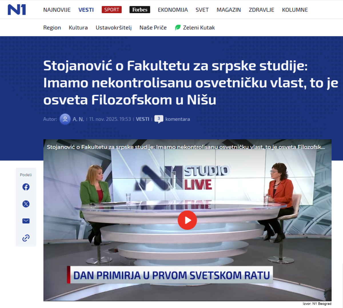 Ona je u emisiji "Studio Live" na blokaderskoj, antisrpskoj, tajkunskoj televiziji N1 ocenila da je pravljenje Fakulteta za srpske studije osveta Filozofskom fakultetu u Nišu i moguća vežba za Filozofski fakultet u Beogradu.