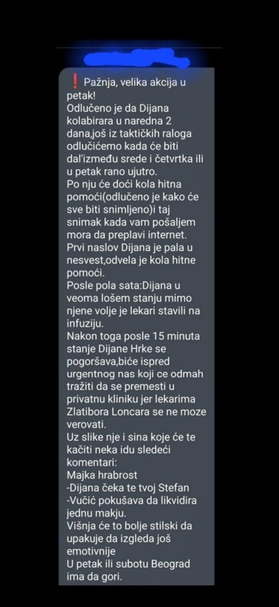 "Pažnja, velika akcija u petak! Odlučeno je da Dijana kolabirara u naredna dva dana... između srede i četvrtka ili u petak rano ujutro. Po nju će doći kola hitna pomoći (odlučeno je kako će sve biti snimljeno) i taj snimak kada vam pošaljem mora da preplavi internet... uz naslov "Dijana je pala u nesvest", odvela je kola hitne pomoći... Nakon toga, posle 15 minuta stanje Dijane Hrke se