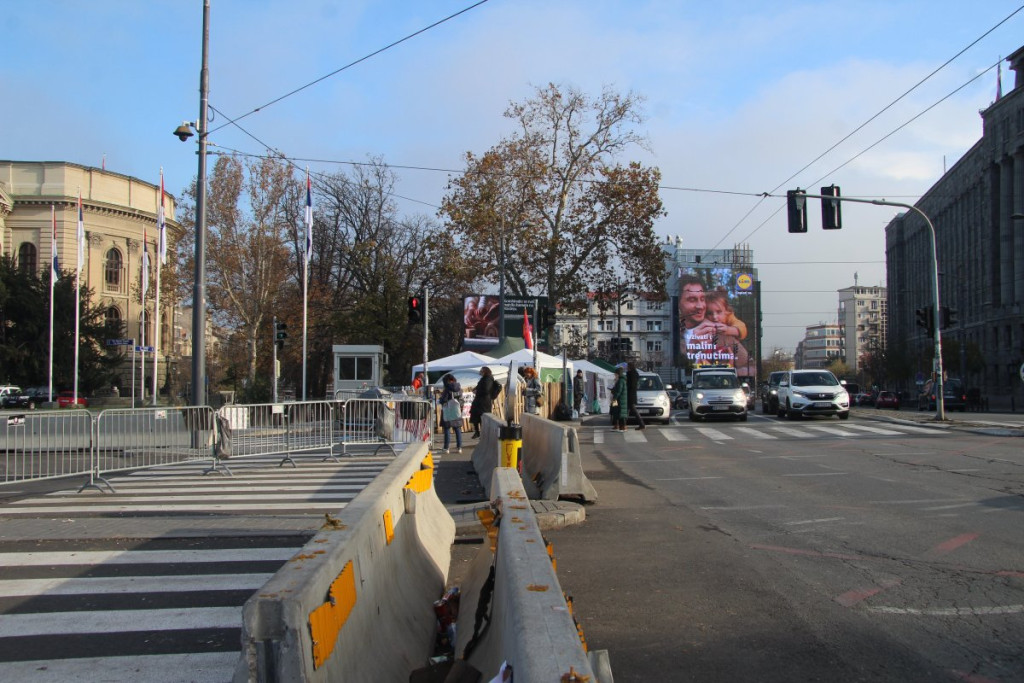 Ispred Skupštine Srbije i ovog jutra je mirno, a saobraćaj na raskrsnici Takovske, Kneza Miloša i Bulevara kralja Aleksandra, koju su prethodnih dana povremeno blokirale grupe blokadera, funkcioniše normalno.