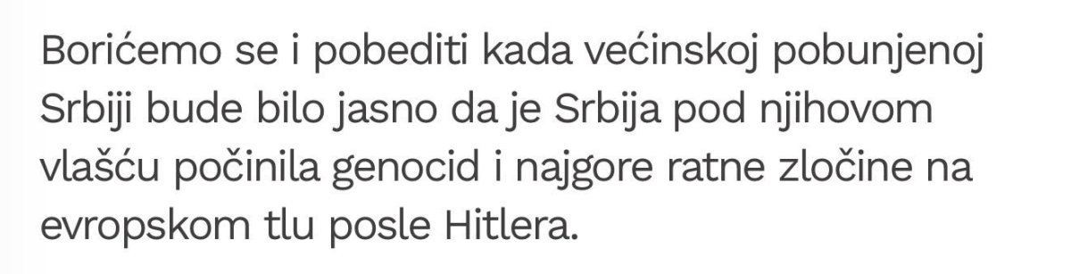 - Borićemo se i pobediti kada većinskoj pobunjenoj Srbiji bude jasno da je Srbija pod njihovom vlašću počinila genocid i najgore ratne zločine na evropskom tlu posle Hitlera - doslovce piše Čongradin za Danas.