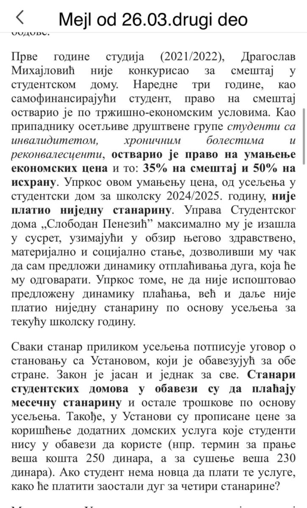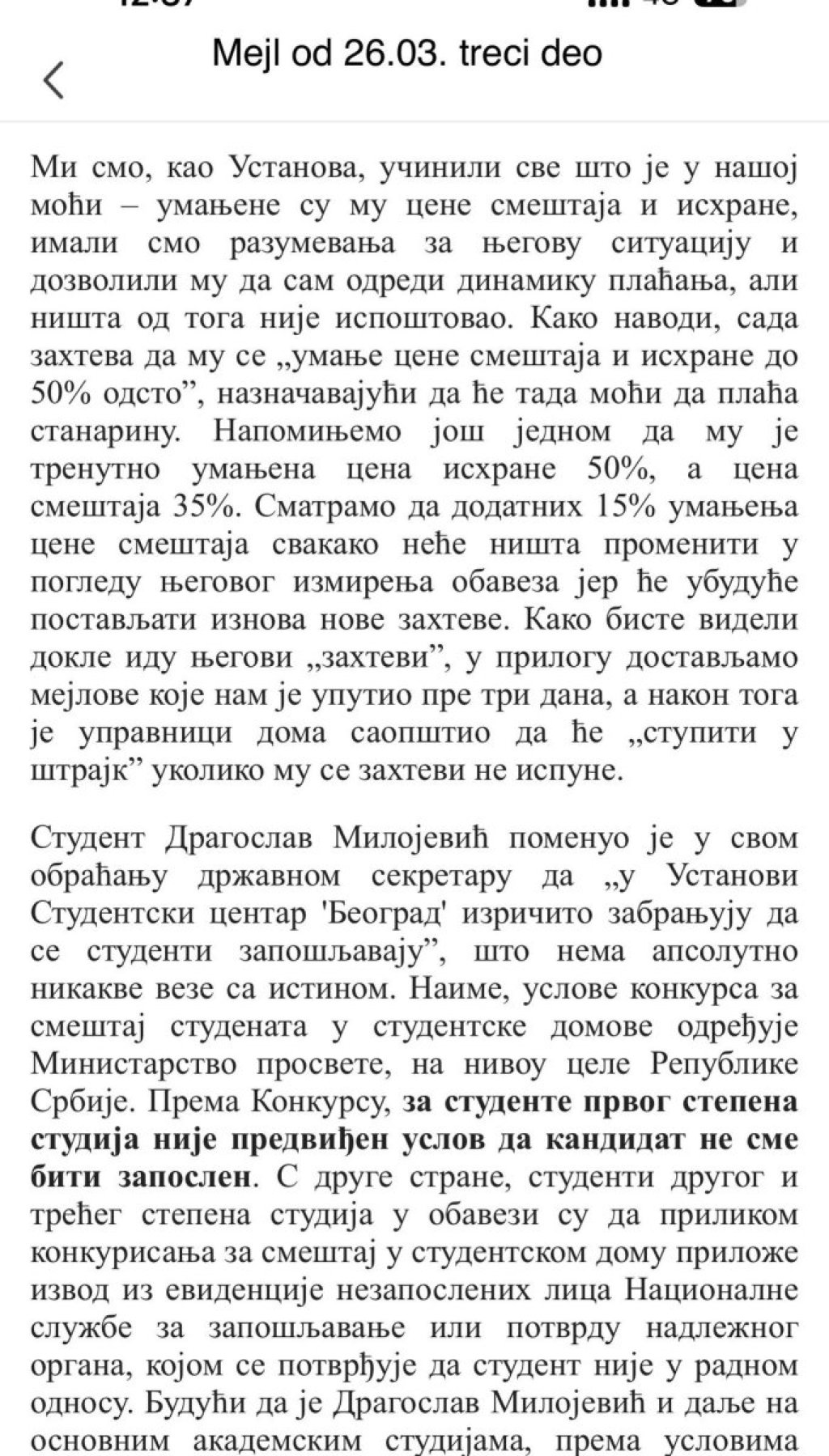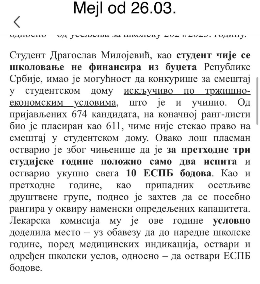 Kako se može videti u dokumentaciji do koje smo došli i koju objavljujemo, Milojević je sakupio svega 10 ESPB bodova, a uz to je napravio dug od 70.000 dinara pošto nije plaćao stanarinu u domu "Slobodan Penezić".