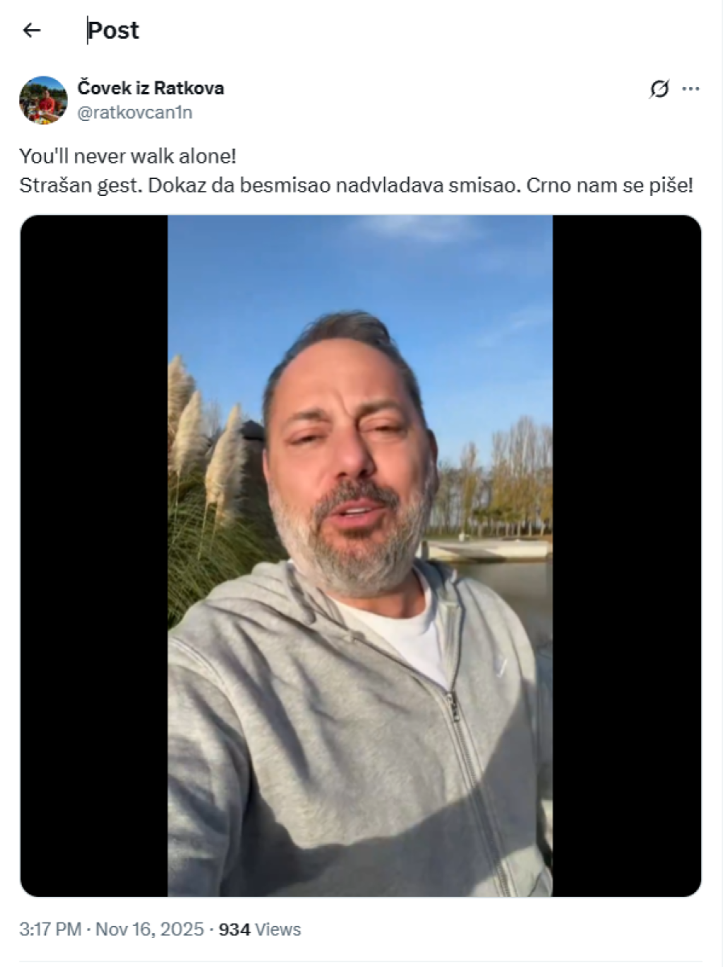 - Nikada nećeš hodati sam (engl. You'll never walk alone). Strašan gest. Dokaz da besmisao nadvladava smisao. Crno nam se piše! - napisao je Babić uz ovaj video-snimak.