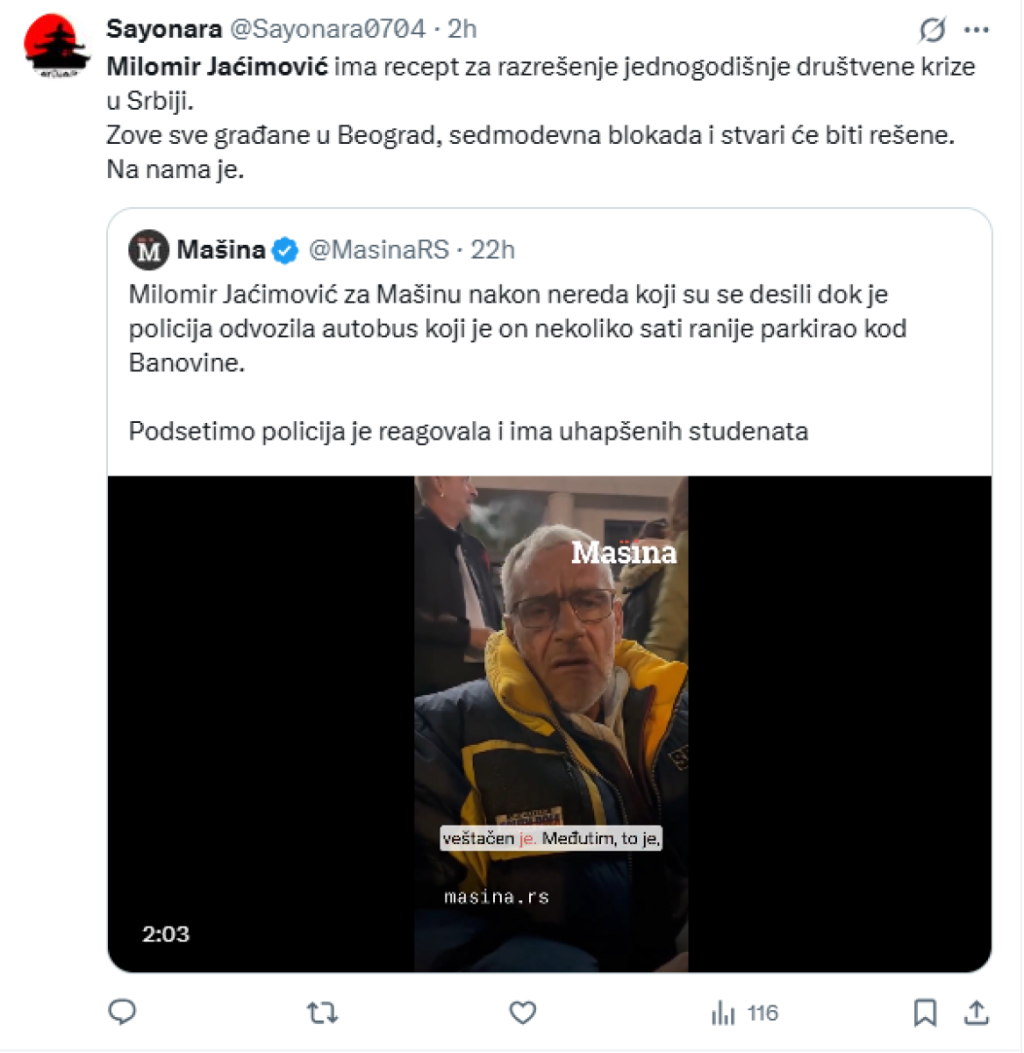 - Pozivam celu Srbiju da se dogovorimo za datum i da idemo u Beograd sedam dana, da zatvorimo Beograd i niko nikud da ne ide dok se ovo ne reši, jer ovo drukčije ne može da se reši - rekao je Jaćimović i dodao kako je to "sada ostala jedina opcija, a na narodu je da odluči".