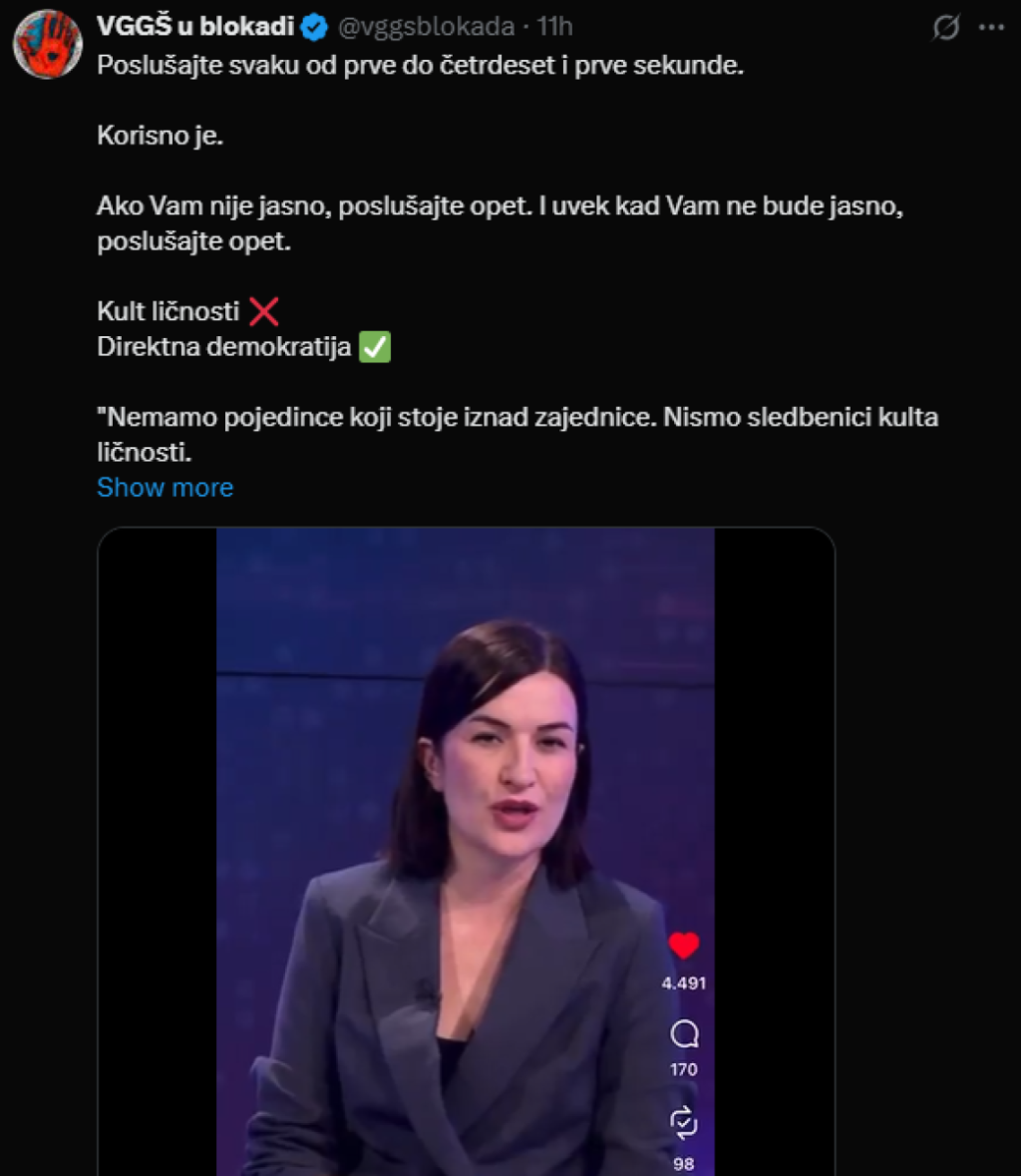Nakon što je Obućina optužila Hrku da radi za strane službe, stvara kult ličnosti i hoće da preuzme blokaderski pokret, studetni u blokadi sa svih fakulteta su podelili taj isečak.